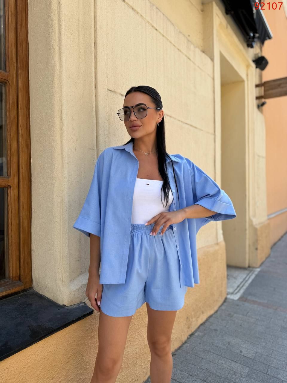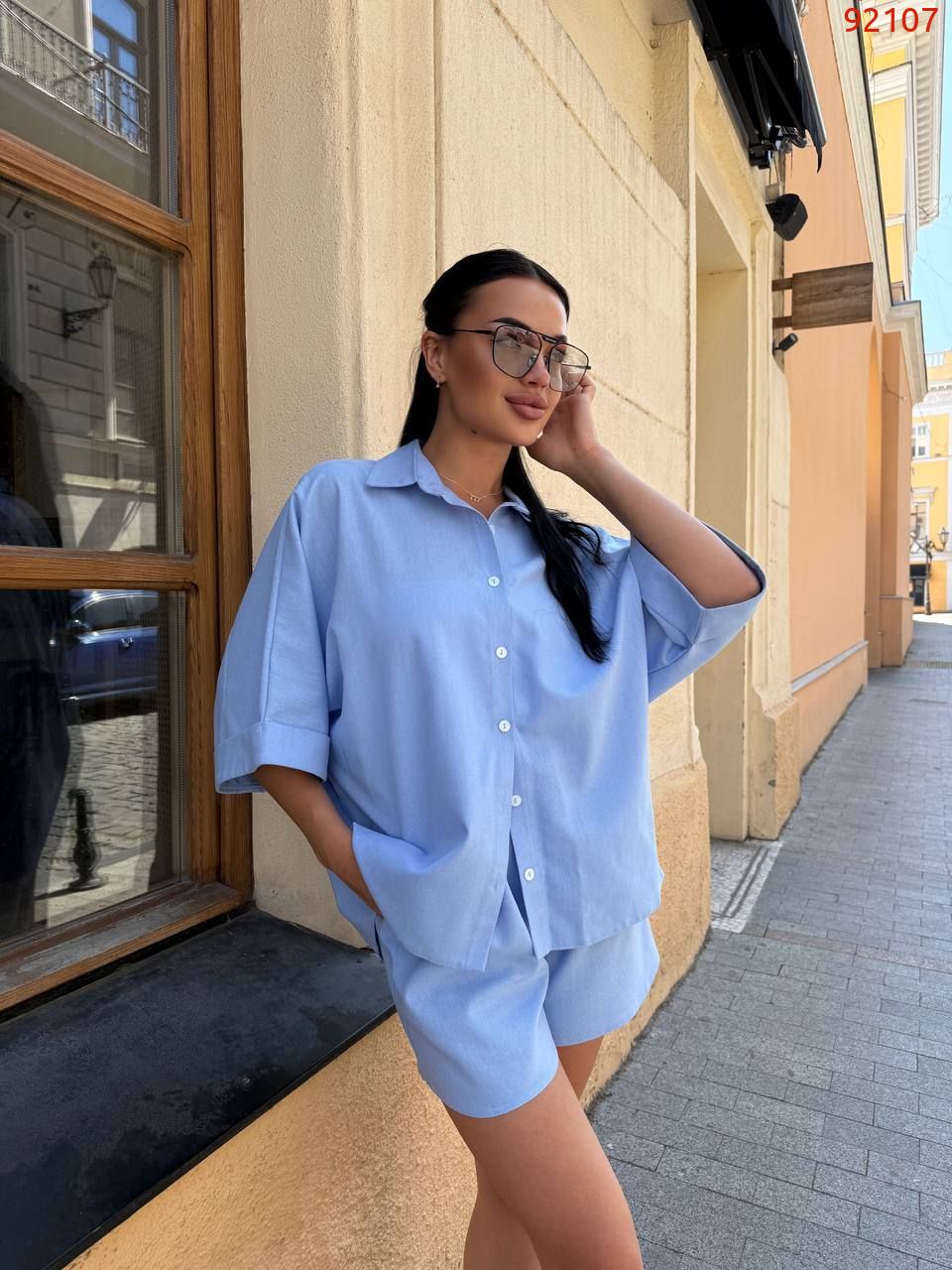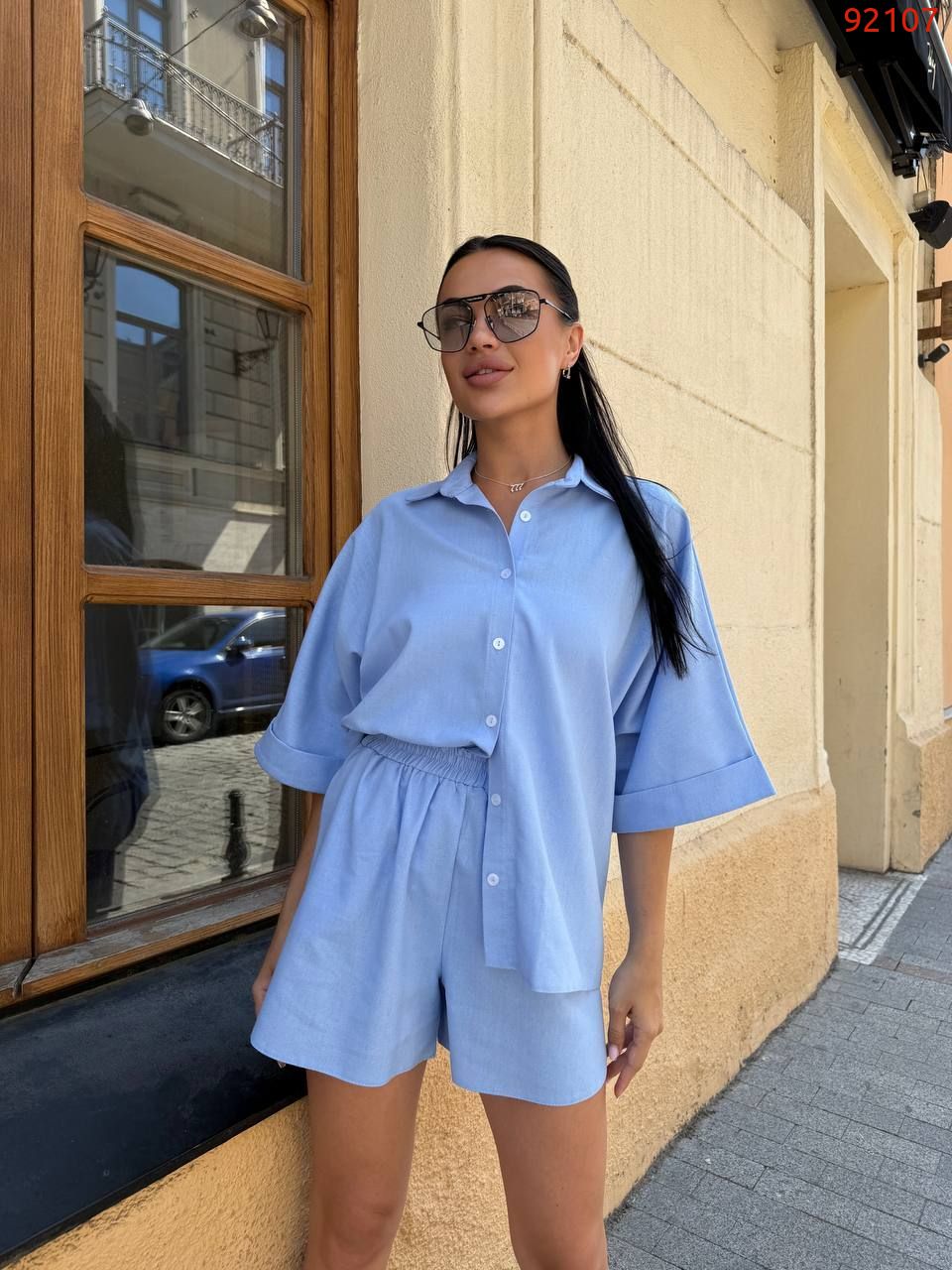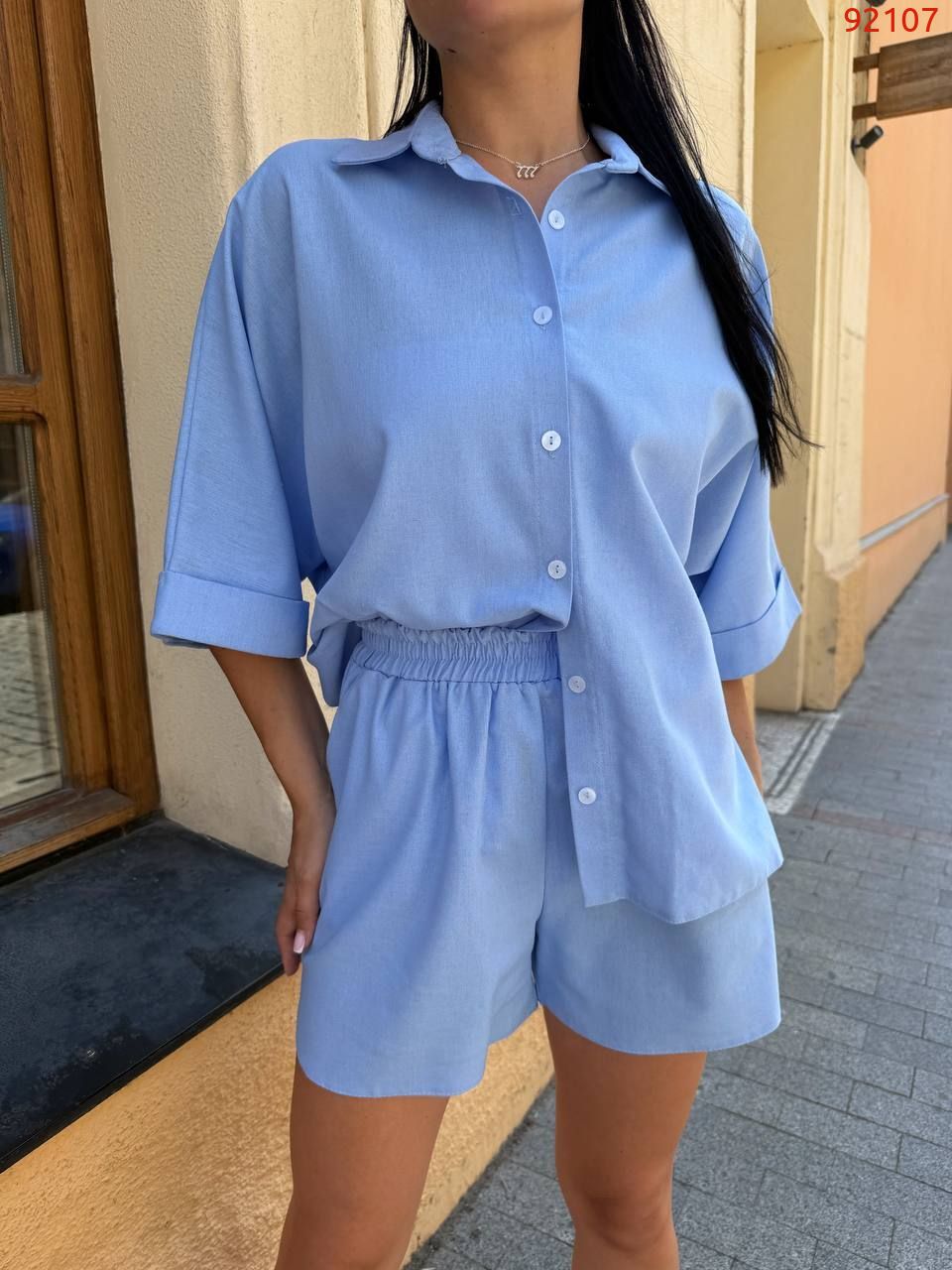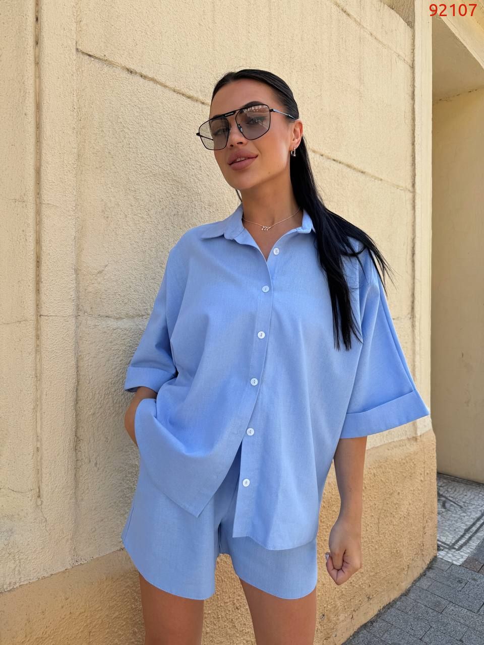Цей костюм виконаний із натуральної лляної тканини.Комплект складається з вільної сорочки з коміром і укорочених шортів