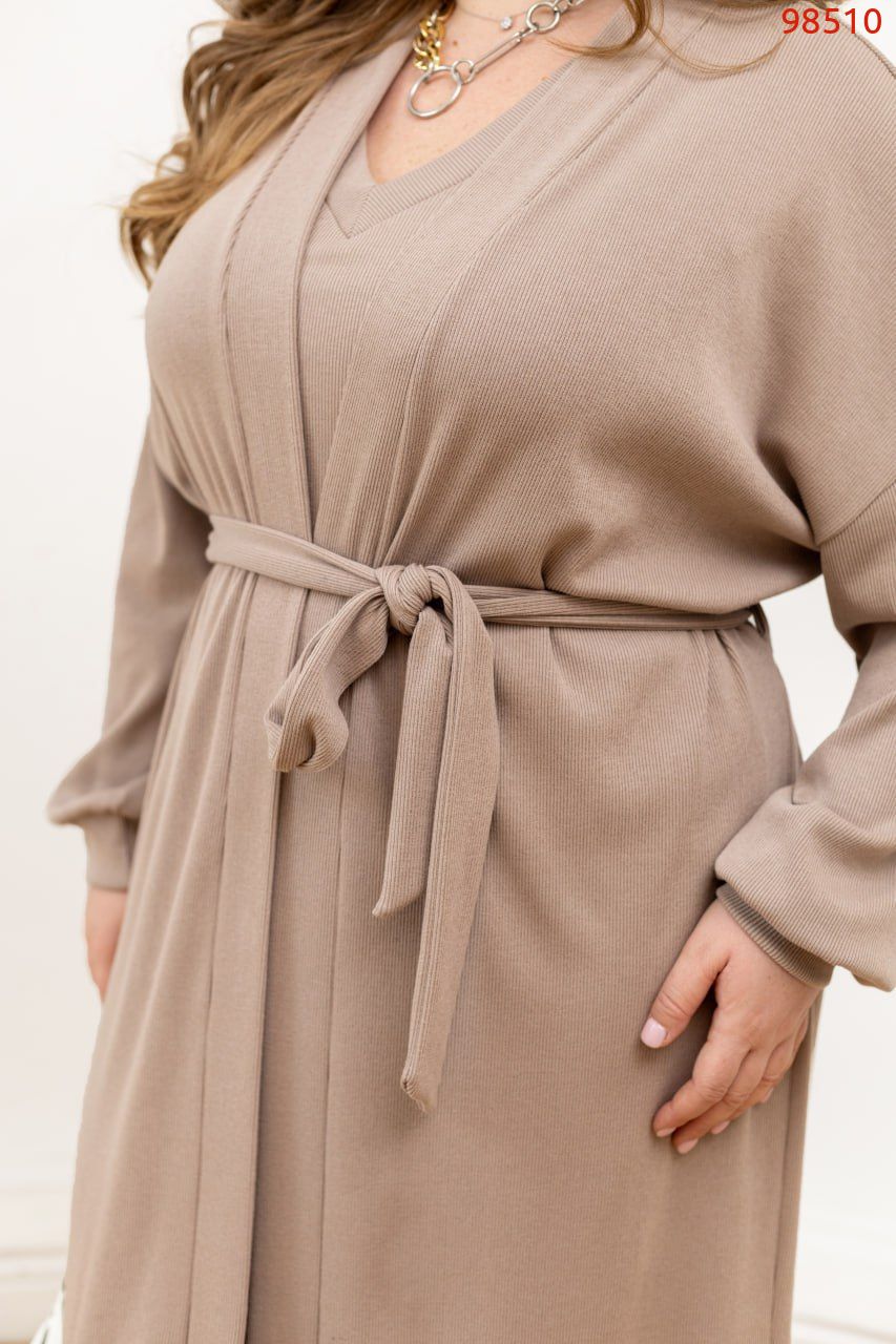Комплект, у якому поєднуються стиль і максимальний комфорт.Максі-сукня прямого крою красиво витягує силует і м’яко підкреслює фігуру. Еластичний трикотаж у рубчик приємний до тіла, добре тягнеться та тримає форму. Довгий кардиган із поясом дозволяє зробити акцент на талії, має зручні кишені та акуратні манжети на рукавах – деталь, що додає завершеності образу. Ідеальний варіант на щодень: змінюєш взуття й настрій – і комплект звучить по-новому