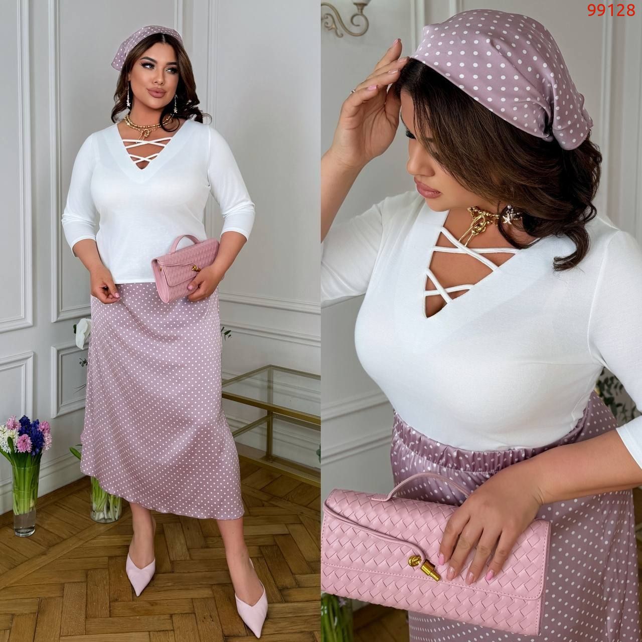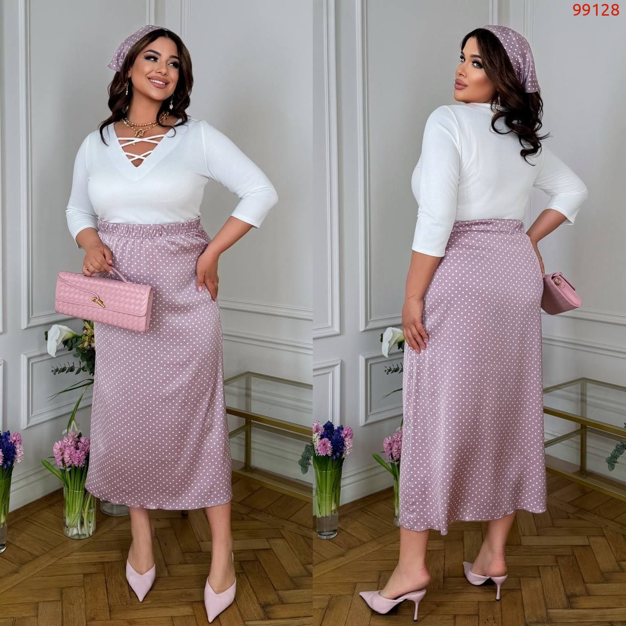 Спідниця покрою трапеція з високою посадкою , пояс на гумці . Кофта з шнурком прямого покрою