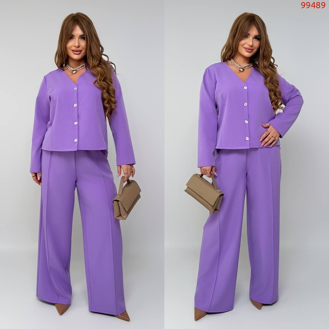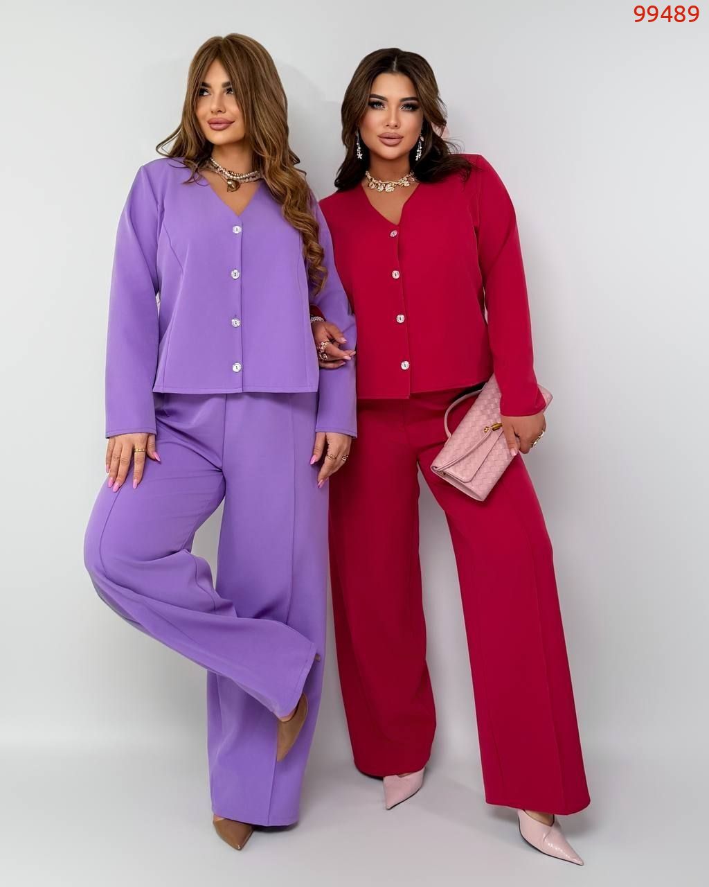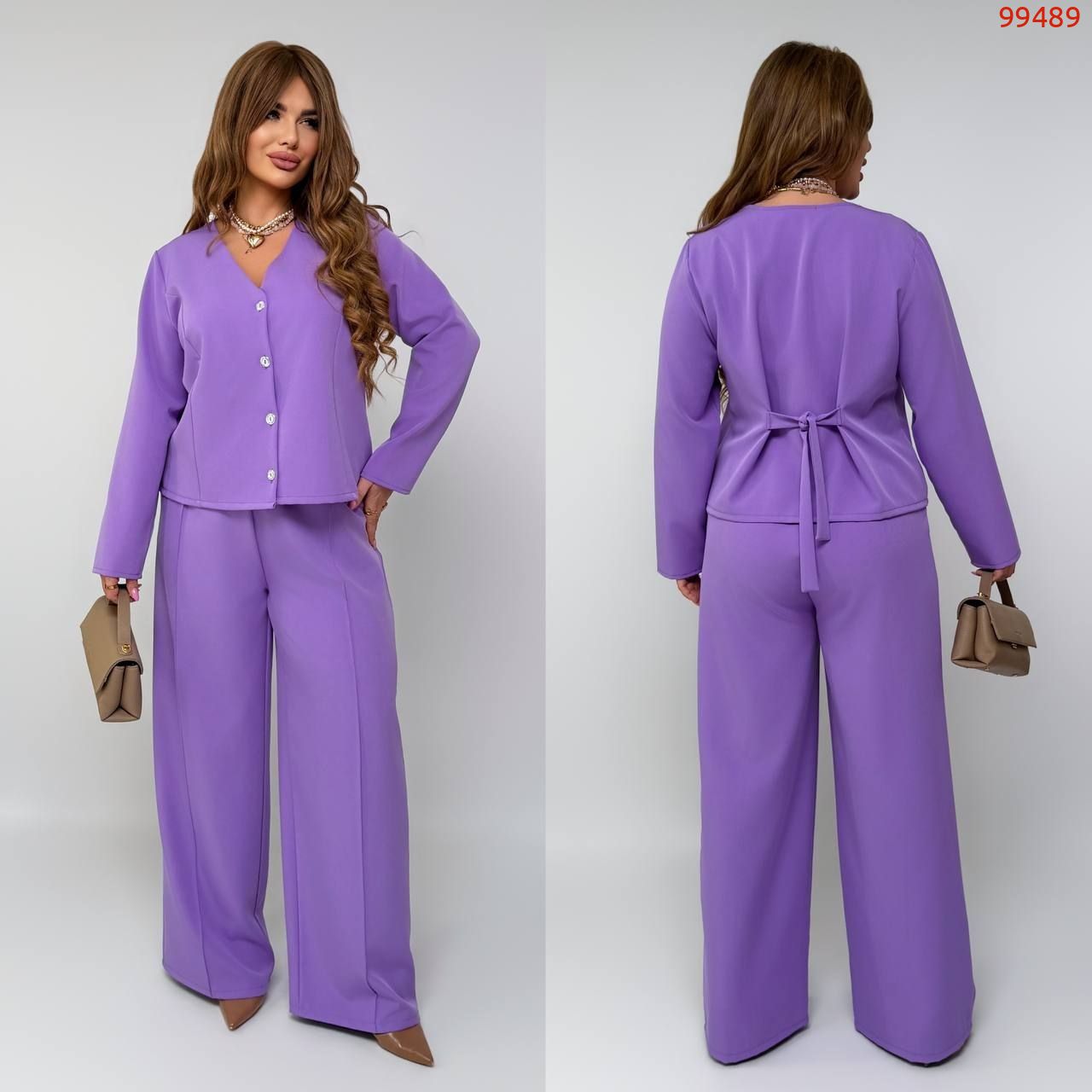 Штани з високою посадкою , пояс на гумці , бічні кишені , з переду стрілки . Піджак на ґудзиках з заду завʼязка .