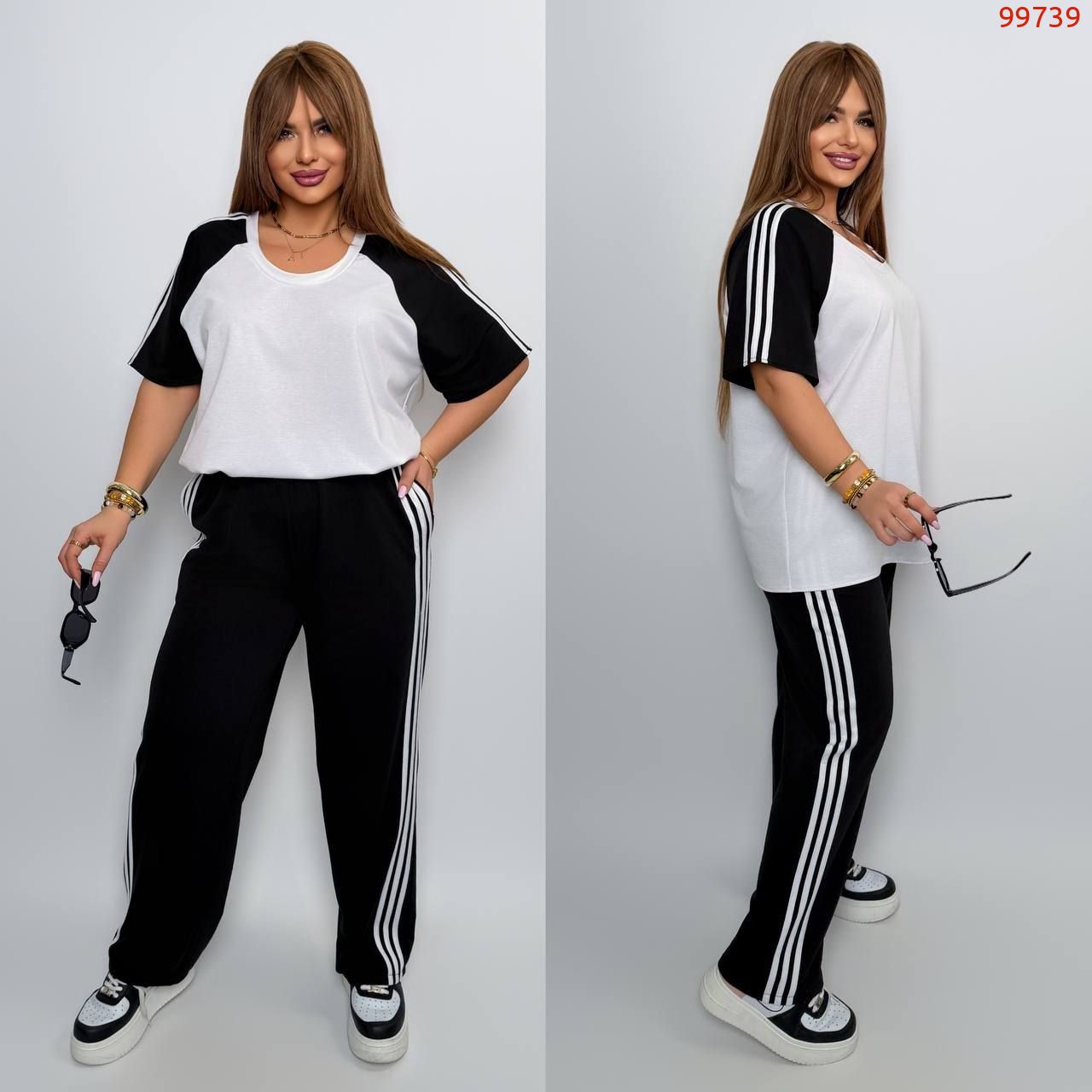Штани з високою посадкою , пояс на гумці , бічні ломпаси , бічні кишені .Футболка вільного покрою , рукав - реглан з ломпасом
