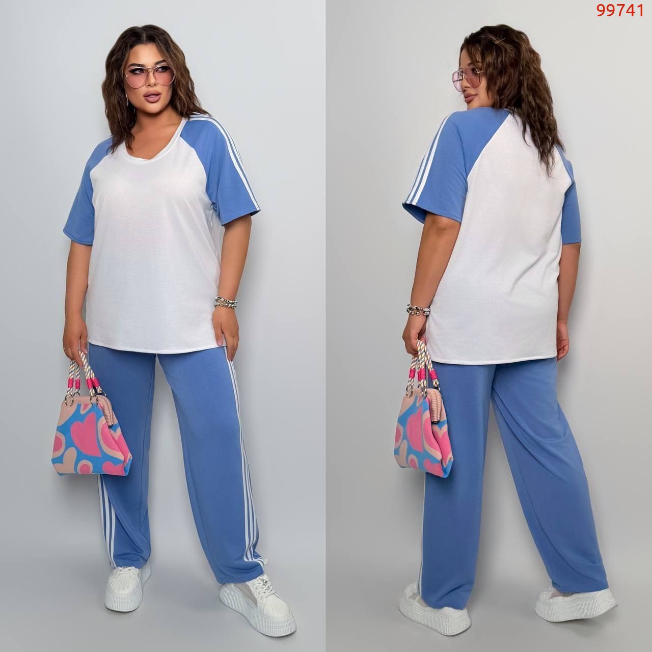 Штани з високою посадкою , пояс на гумці , бічні ломпаси , бічні кишені .Футболка вільного покрою , рукав - реглан з ломпасом