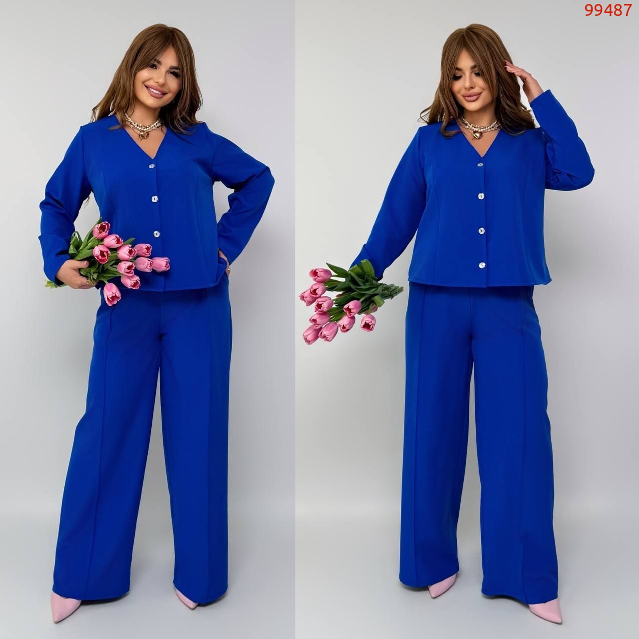 Штани з високою посадкою , пояс на гумці , бічні кишені , з переду стрілки . Піджак на ґудзиках з заду завʼязка .