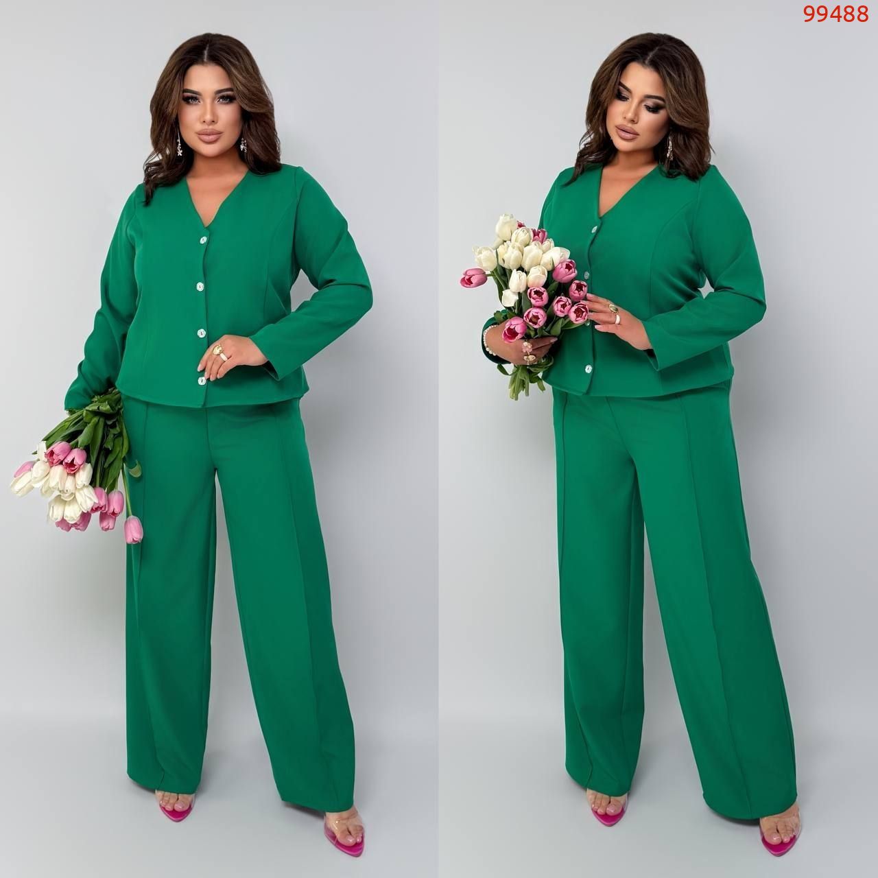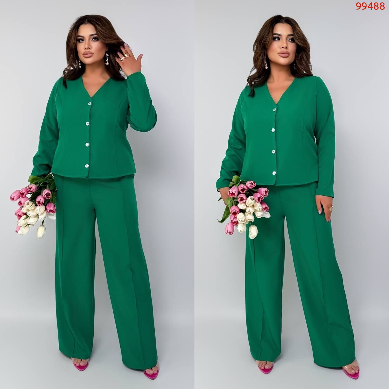 Штани з високою посадкою , пояс на гумці , бічні кишені , з переду стрілки . Піджак на ґудзиках з заду завʼязка .