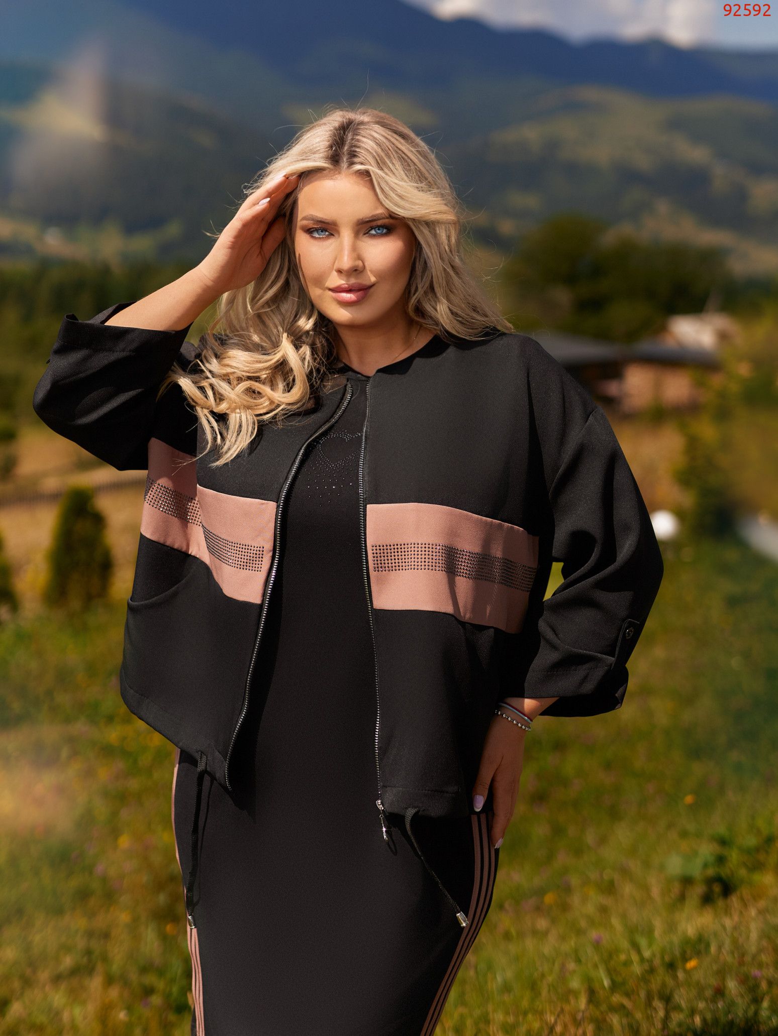▪︎ Бомбер виконаний із щільної костюмної тканини діагональ, застібається на блискавку, має куліску з фіксацією по низу та рукави з патиками на ґудзиках.