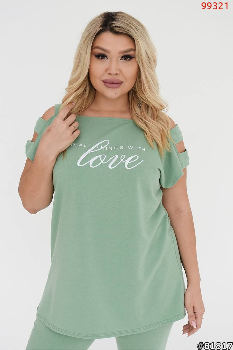 Кофта вільного крою з відкритими плечима прикрашена декоративними розрізами на лямках. Штани довжиною до середини ікри, що облягають, з еластичного матеріалу.