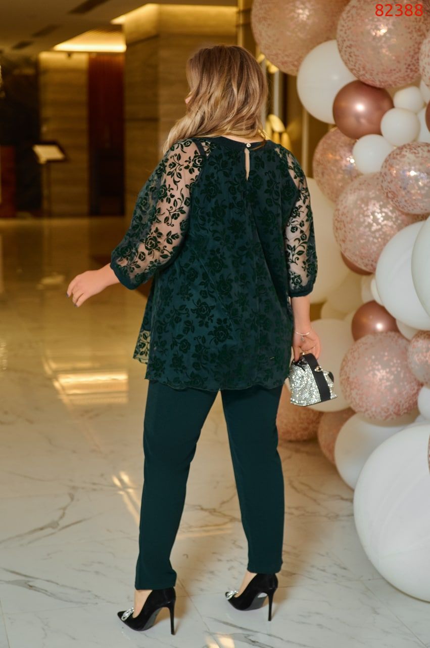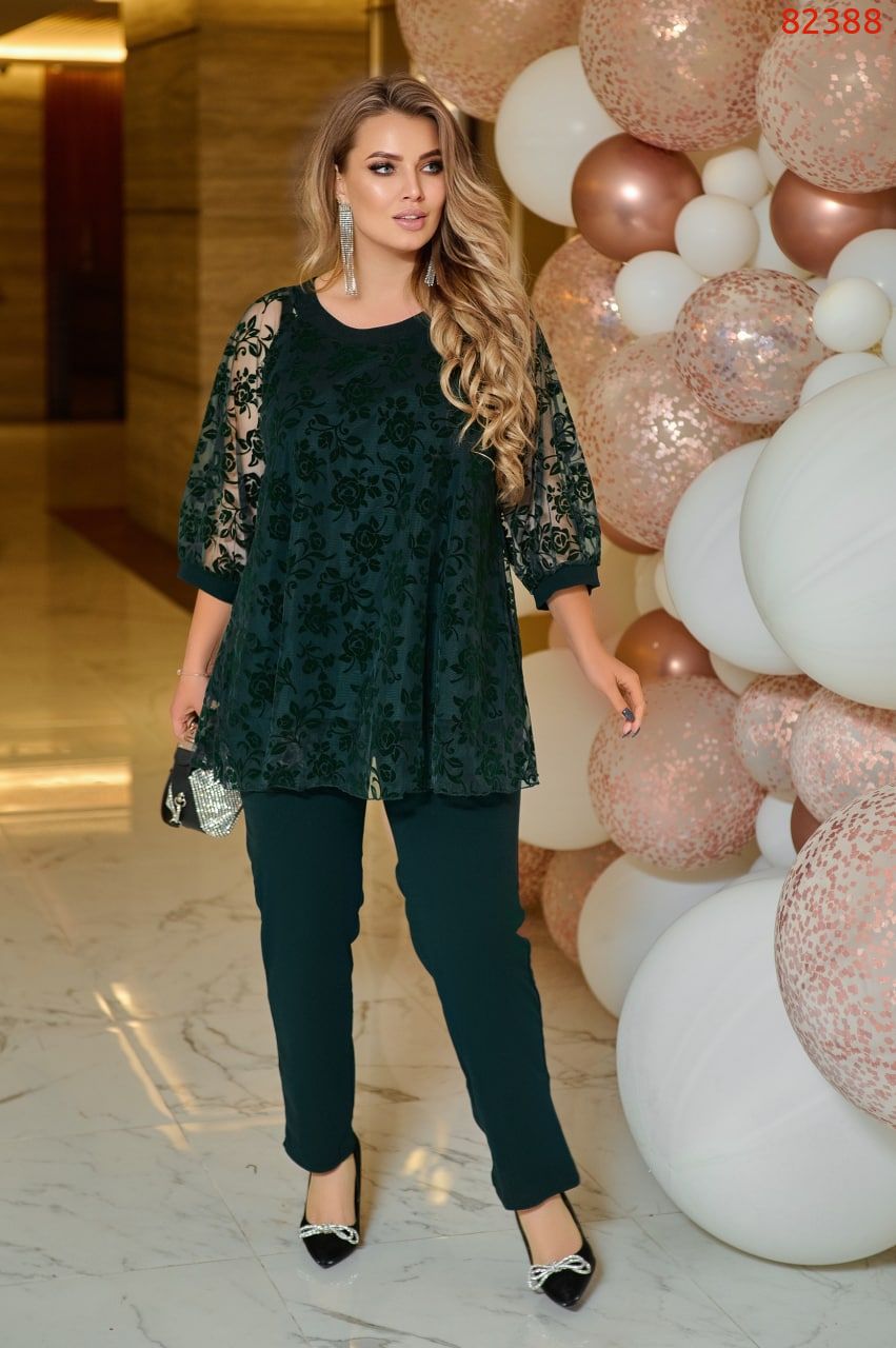 Комплект брючный. Блуза свободного покроя. Блузка со сборкой на горловине, оформленной декоративной планкой. По спинке средний шов. Рукав реглан. По низу рукава притачная манжета. Брюки классического кроя, слегка заужены к низу, на резинке.