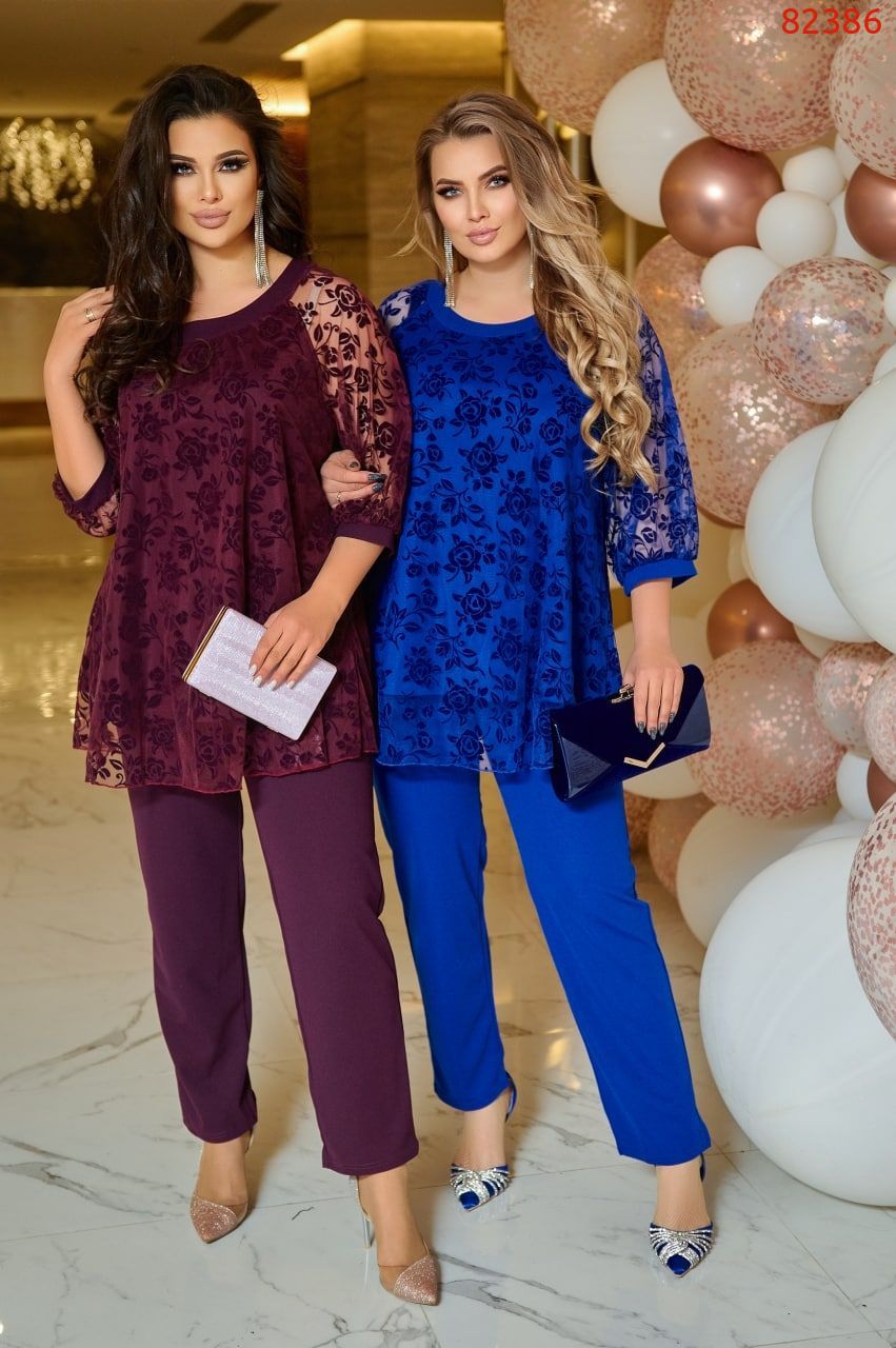 Комплект брючный. Блуза свободного покроя. Блузка со сборкой на горловине, оформленной декоративной планкой. По спинке средний шов. Рукав реглан. По низу рукава притачная манжета. Брюки классического кроя, слегка заужены к низу, на резинке.