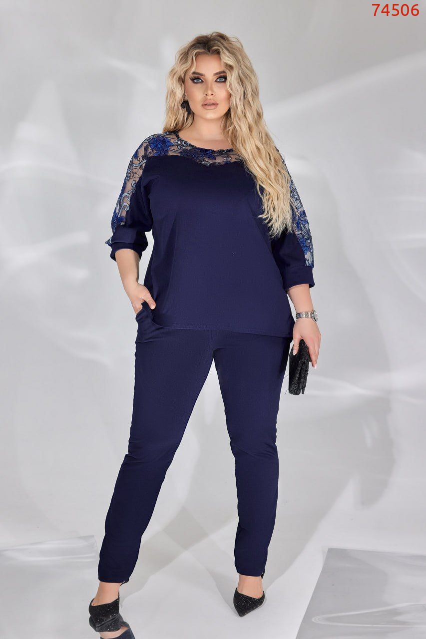 Ошатний комплект з класичними брюками злегка звуженими. Блуза середньої довжини вільного силуету, рукав 3/4. Таке вбрання гарантує вам максимальний комфорт та затишок! Це неймовірно практичний та зручний жіночий костюм представлений у різних відтінках.