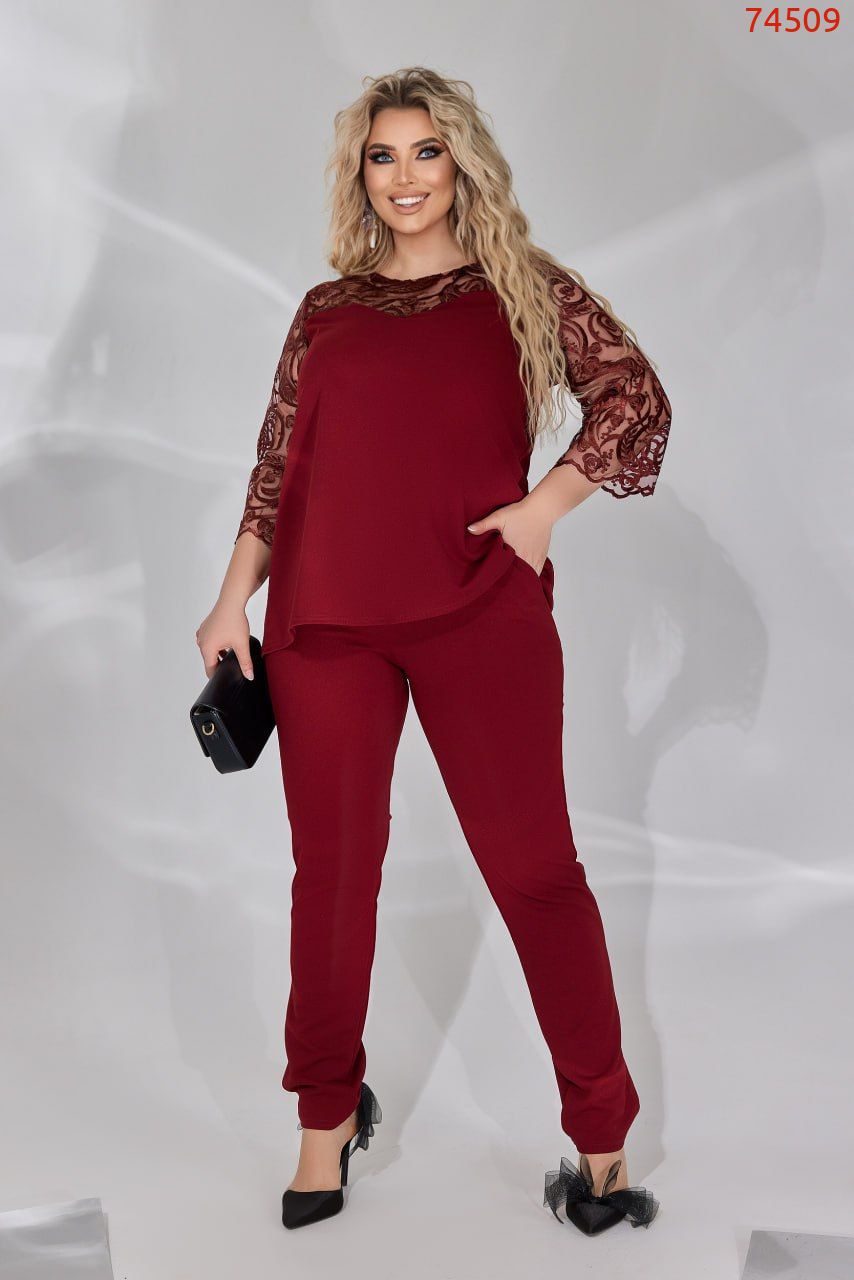 Жіночий костюм вільного силуету складається з блузи і штанів. Блуза, комбінована з двох різних за фактурою тканин. Тканина добре лягає, виглядає дуже багато, красиво. Дана модель підійде для жінок будь-якого віку, хто хоче бути неповторною та найелегантнішою.