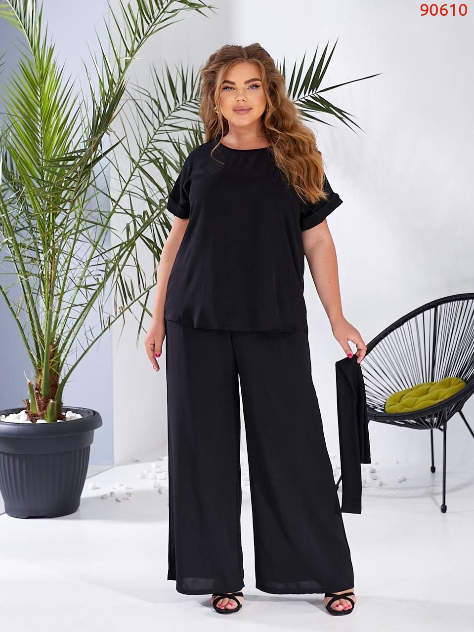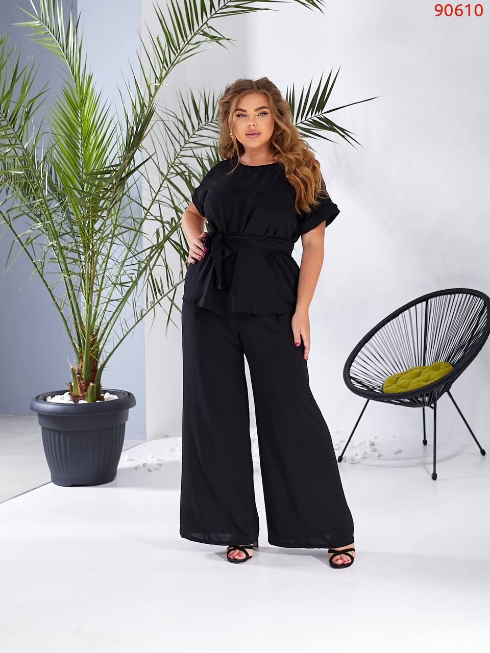 Ідеальний набір на літо. Універсальний і зручний жіночий брючний костюм, з м'якого матеріалу - "американський креп-жатка", для повсякденного носіння. Легкий, комфортний, виглядає цілісно на фігурі, візуально подовжуючи її. Блуза з суцільнокроєним рукавом, довжиною до ліктя, по низу з цільною манжетою, що відвертається, декором служить гудзик. Штани по верху з поясом на гумці. Також по верху передніх половинок односторонні складки, що надають пишність штанам, декором служать гудзики. Комплект сміливо поєднується з будь-яким взуттям.