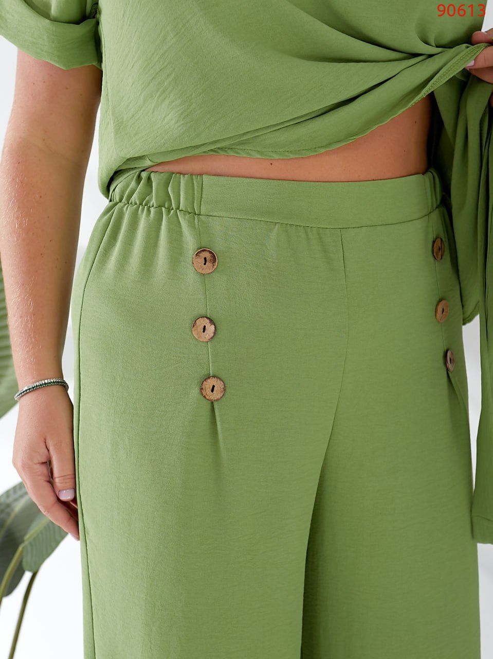 Ідеальний набір на літо. Універсальний і зручний жіночий брючний костюм, з м'якого матеріалу - "американський креп-жатка", для повсякденного носіння. Легкий, комфортний, виглядає цілісно на фігурі, візуально подовжуючи її. Блуза з суцільнокроєним рукавом, довжиною до ліктя, по низу з цільною манжетою, що відвертається, декором служить гудзик. Штани по верху з поясом на гумці. Також по верху передніх половинок односторонні складки, що надають пишність штанам, декором служать гудзики. Комплект сміливо поєднується з будь-яким взуттям.