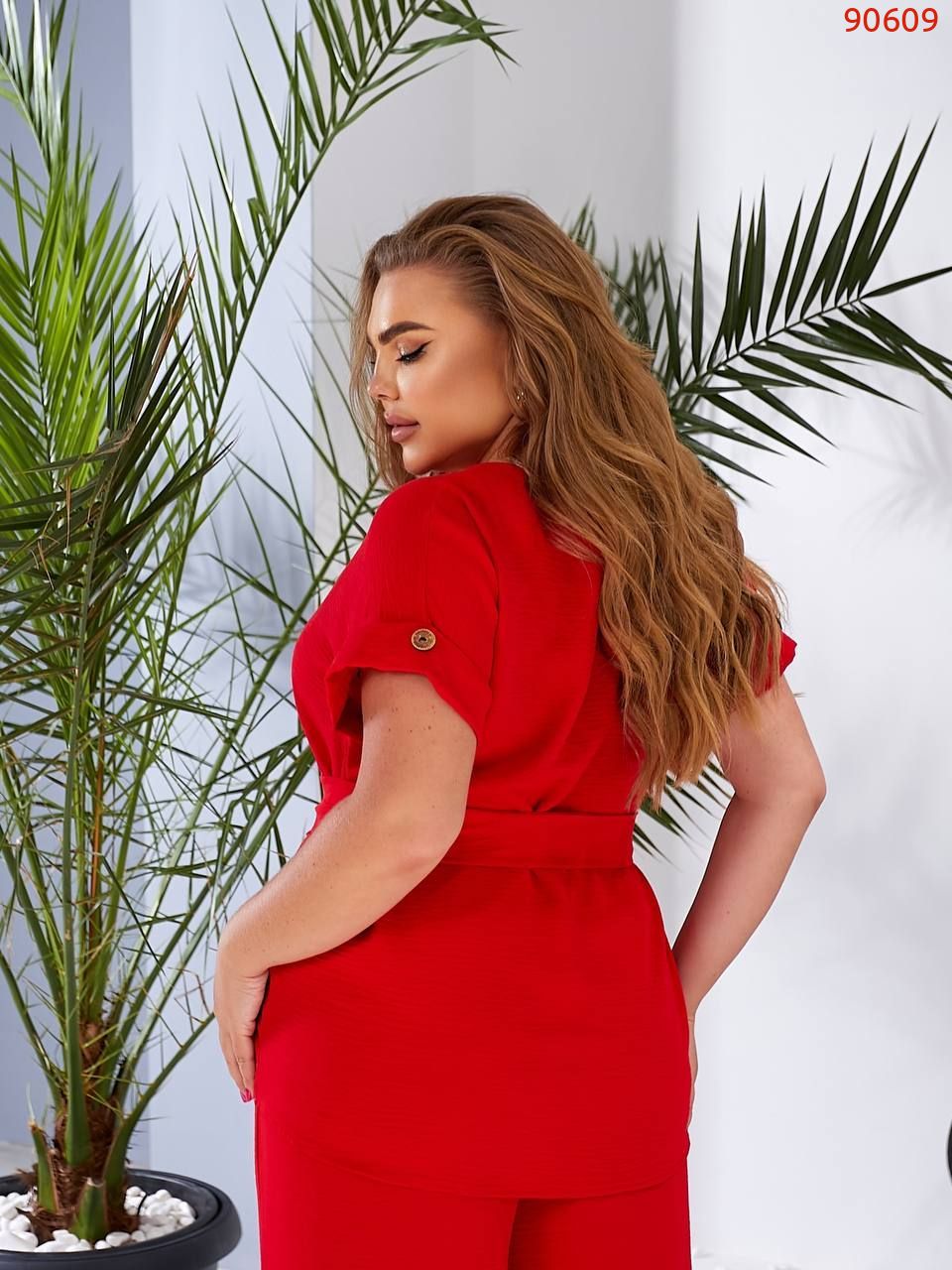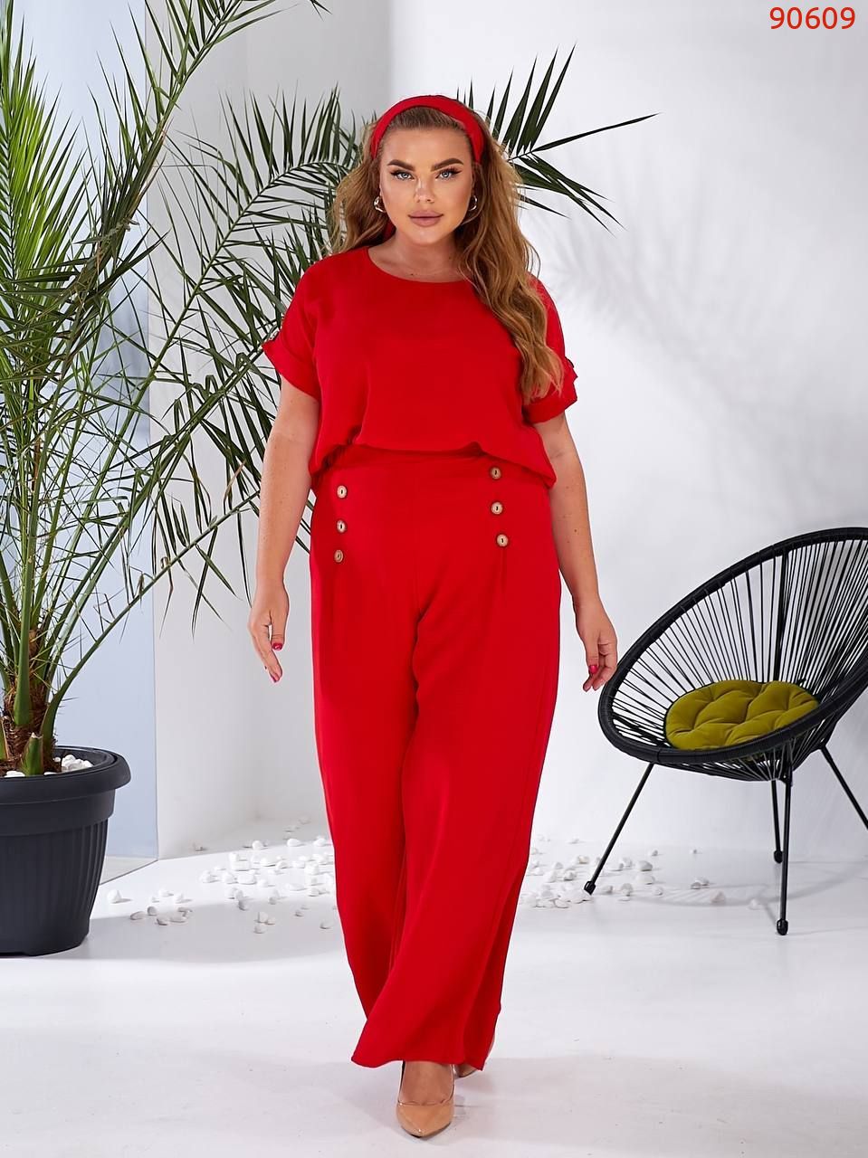 Ідеальний набір на літо. Універсальний і зручний жіночий брючний костюм, з м'якого матеріалу - "американський креп-жатка", для повсякденного носіння. Легкий, комфортний, виглядає цілісно на фігурі, візуально подовжуючи її. Блуза з суцільнокроєним рукавом, довжиною до ліктя, по низу з цільною манжетою, що відвертається, декором служить гудзик. Штани по верху з поясом на гумці. Також по верху передніх половинок односторонні складки, що надають пишність штанам, декором служать гудзики. Комплект сміливо поєднується з будь-яким взуттям.
