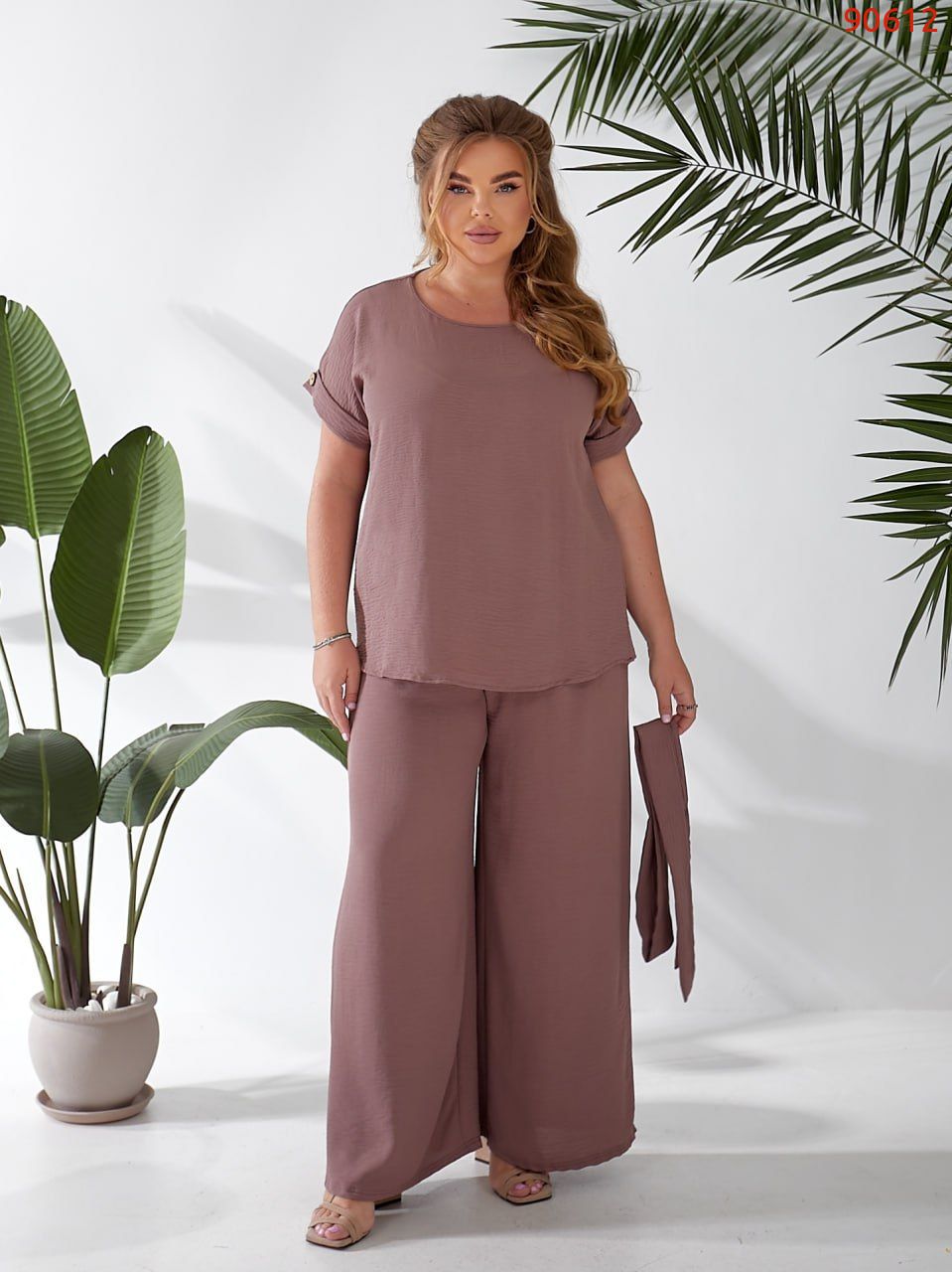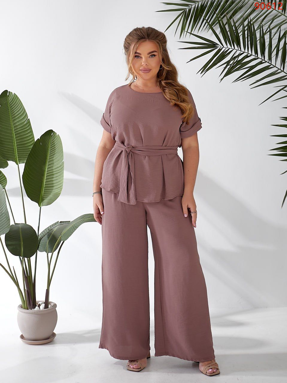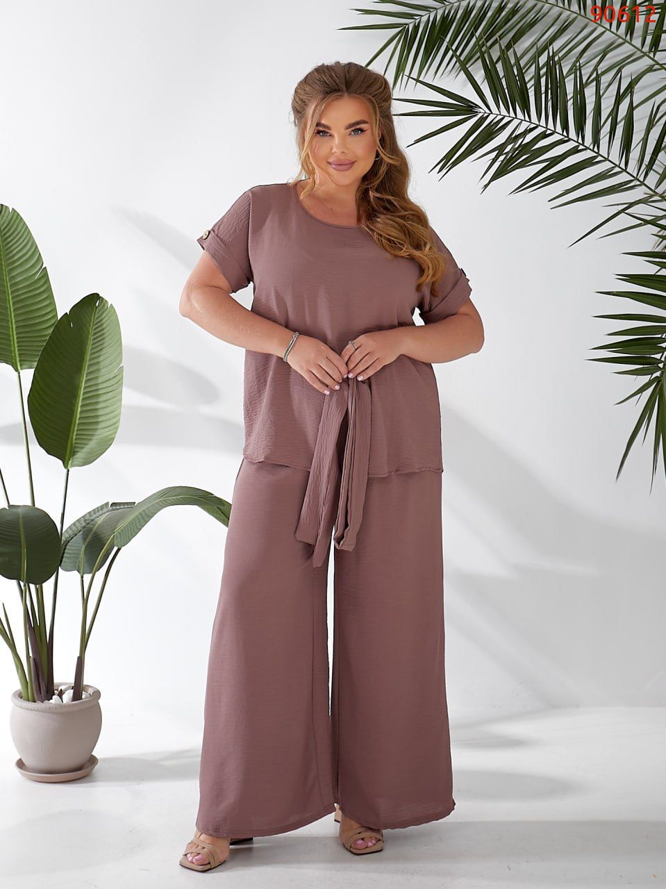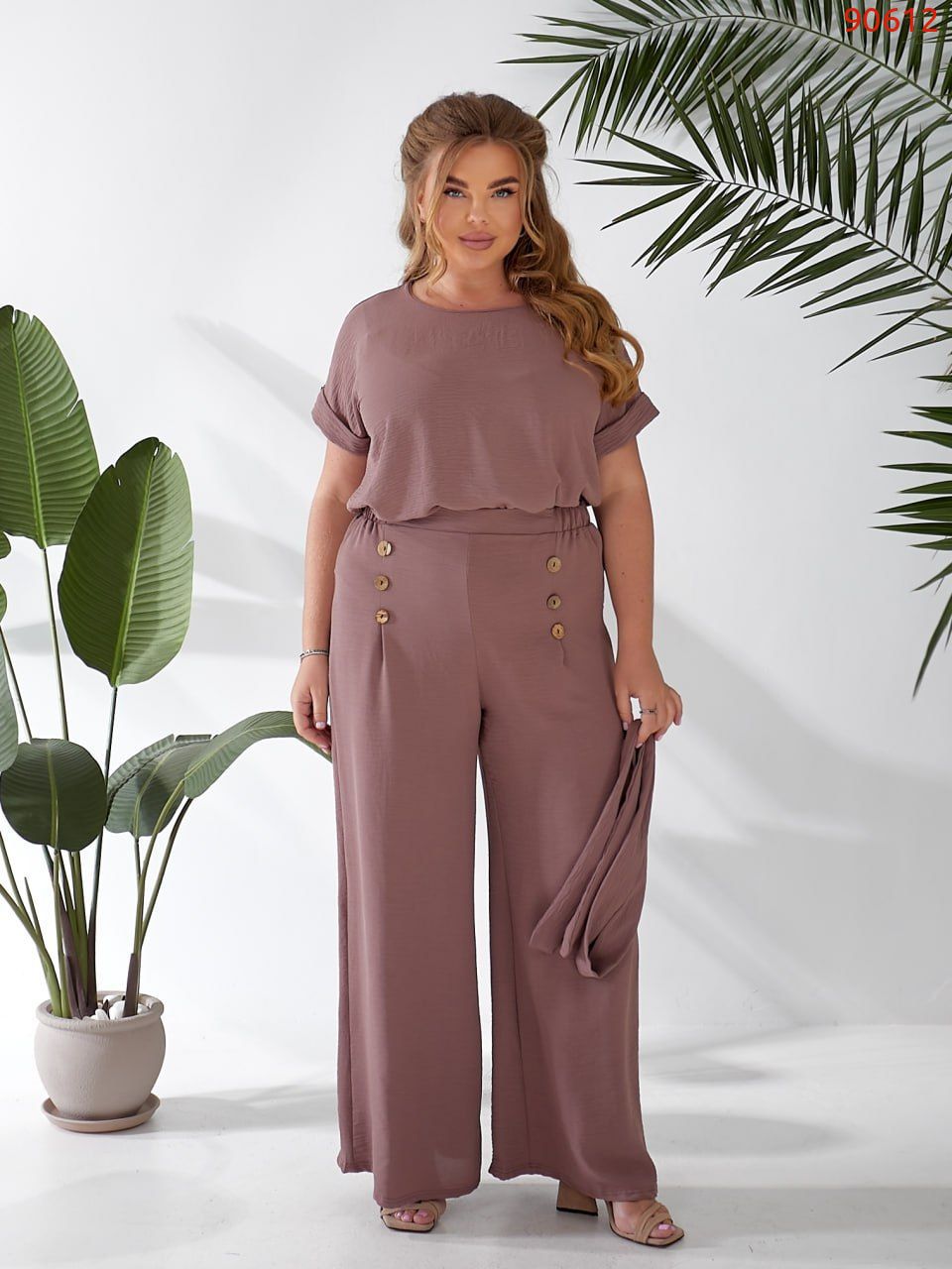 Ідеальний набір на літо. Універсальний і зручний жіночий брючний костюм, з м'якого матеріалу - "американський креп-жатка", для повсякденного носіння. Легкий, комфортний, виглядає цілісно на фігурі, візуально подовжуючи її. Блуза з суцільнокроєним рукавом, довжиною до ліктя, по низу з цільною манжетою, що відвертається, декором служить гудзик. Штани по верху з поясом на гумці. Також по верху передніх половинок односторонні складки, що надають пишність штанам, декором служать гудзики. Комплект сміливо поєднується з будь-яким взуттям.