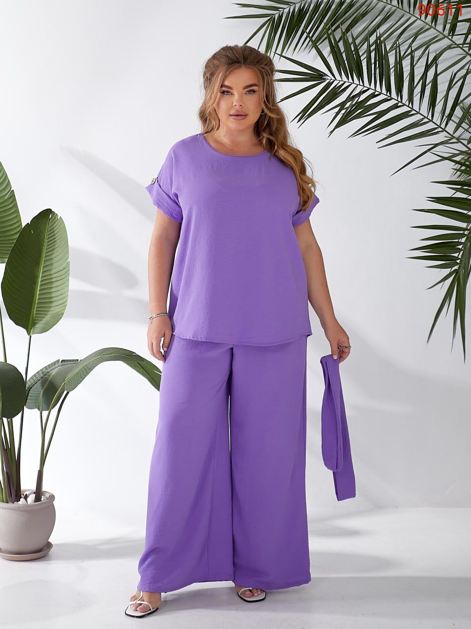 Ідеальний набір на літо. Універсальний і зручний жіночий брючний костюм, з м'якого матеріалу - "американський креп-жатка", для повсякденного носіння. Легкий, комфортний, виглядає цілісно на фігурі, візуально подовжуючи її. Блуза з суцільнокроєним рукавом, довжиною до ліктя, по низу з цільною манжетою, що відвертається, декором служить гудзик. Штани по верху з поясом на гумці. Також по верху передніх половинок односторонні складки, що надають пишність штанам, декором служать гудзики. Комплект сміливо поєднується з будь-яким взуттям.