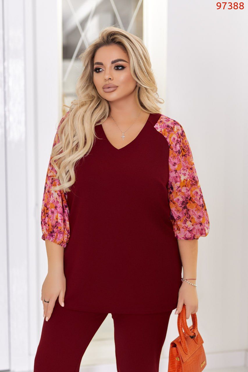 Створити ошатний образ із брюками можливо разом з нашою новинкою! Комплект складається з блузи та штанів. Блуза прямого силуету. Рукава реглан з прозорої тканини з принтом, що контрастно поєднується з основною тканиною виробу. Низ рукава оброблений на резинку. Горловина V-подібної форми. У бічних швах розрізи блузки. Перед нагрудними виточками. Штани сідають по фігурі, середня посадка, з кишенями. Відчуйте себе впевненою та стильною у будь-якій ситуації!