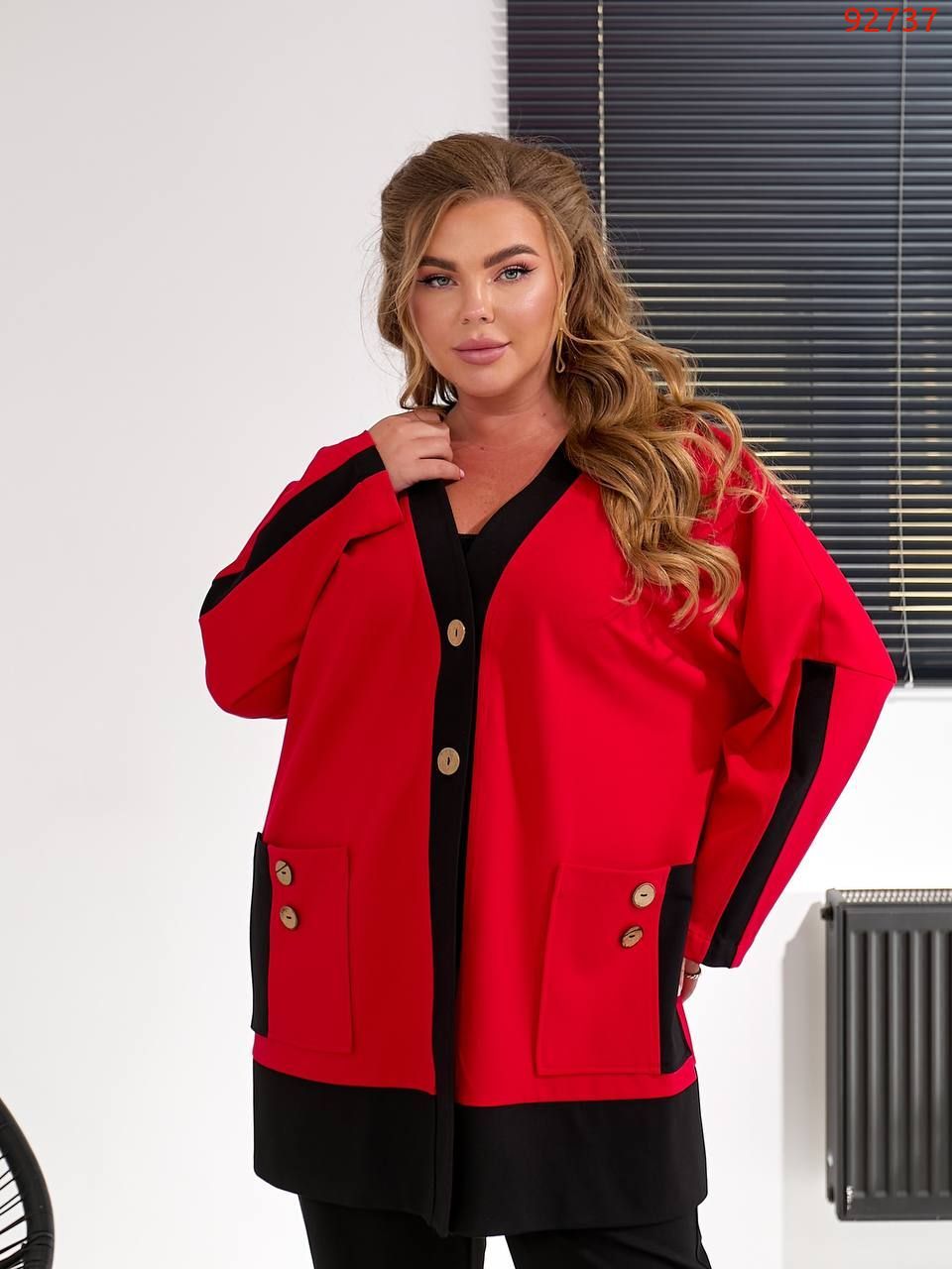 довжина піджака 85 см, рукав від горловини 70 см, можна зробити манжетом ніз рукава, плече спущене, тому по обхвату біцепса дуже вільно. Довжина штанів 109