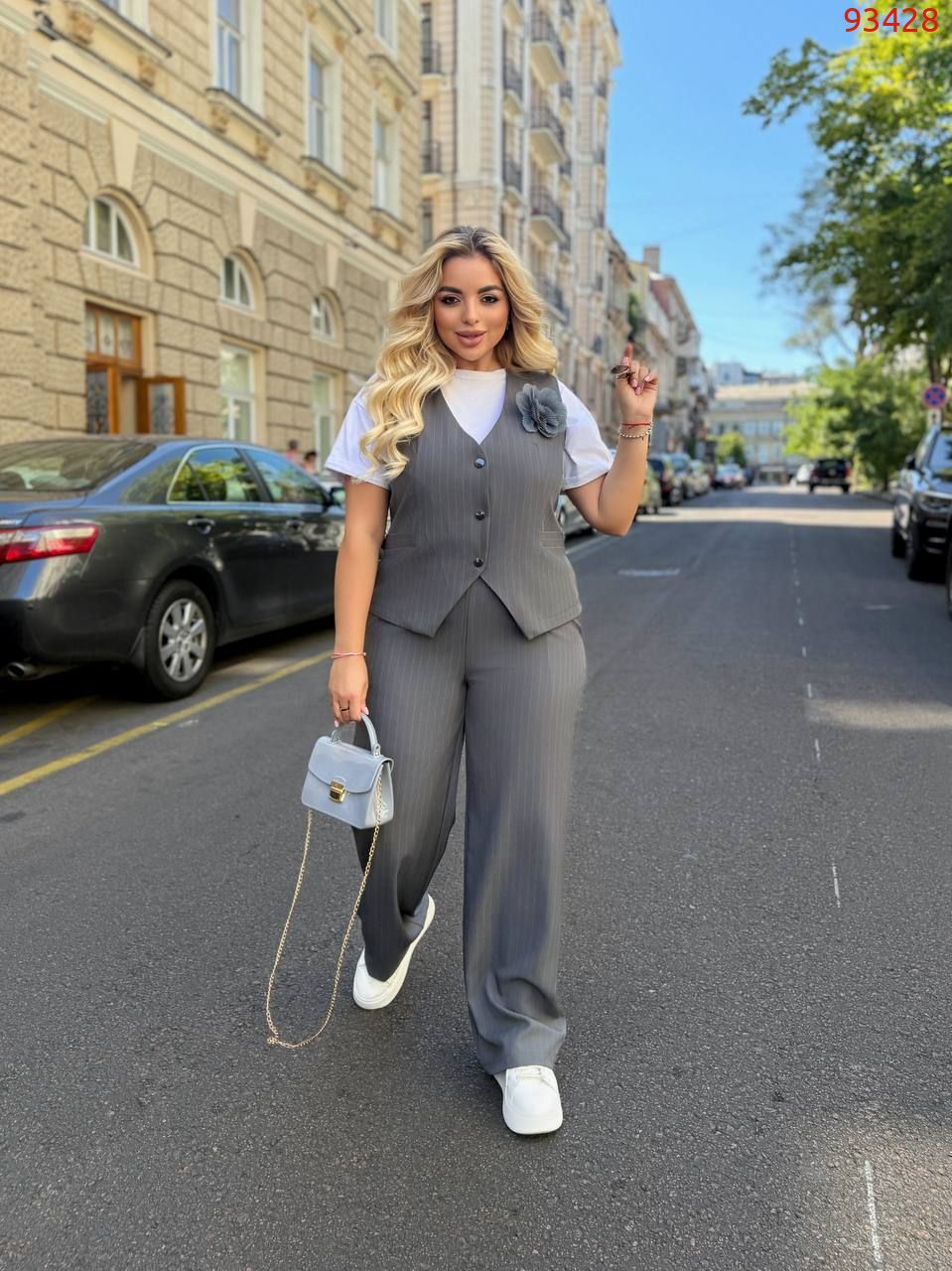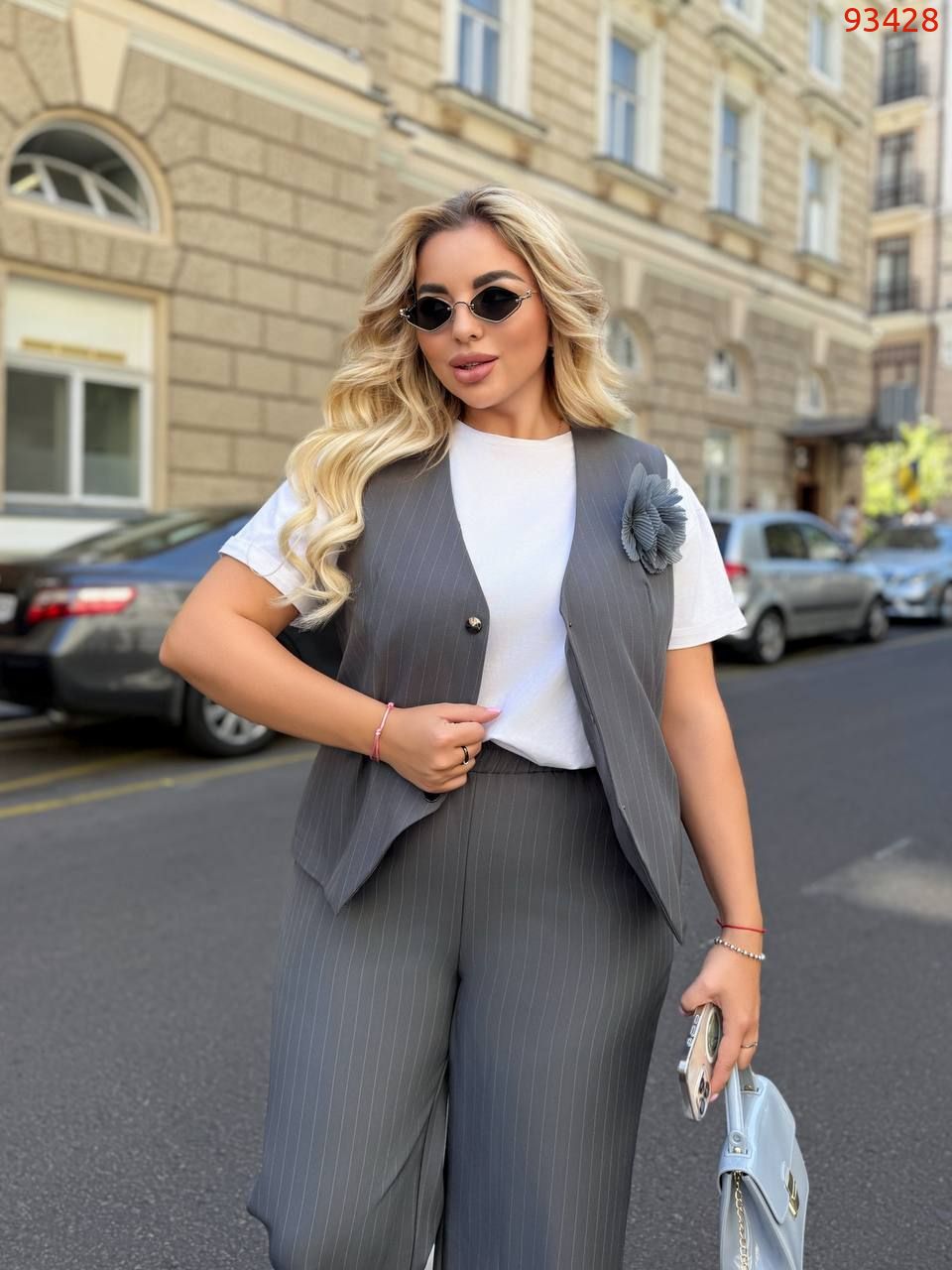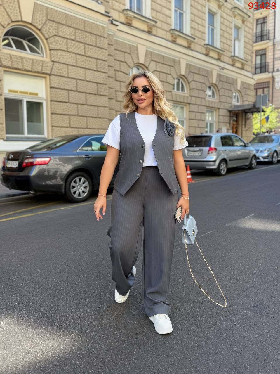 Ідеальний вибір для повсякденних образів та офісного стилю. Жилет доповнений декоративною з'ємною квіткою, яка додає жіночності, а штани забезпечують свободу рухів. Поєднується як з футболками, так і з класичними блузами.