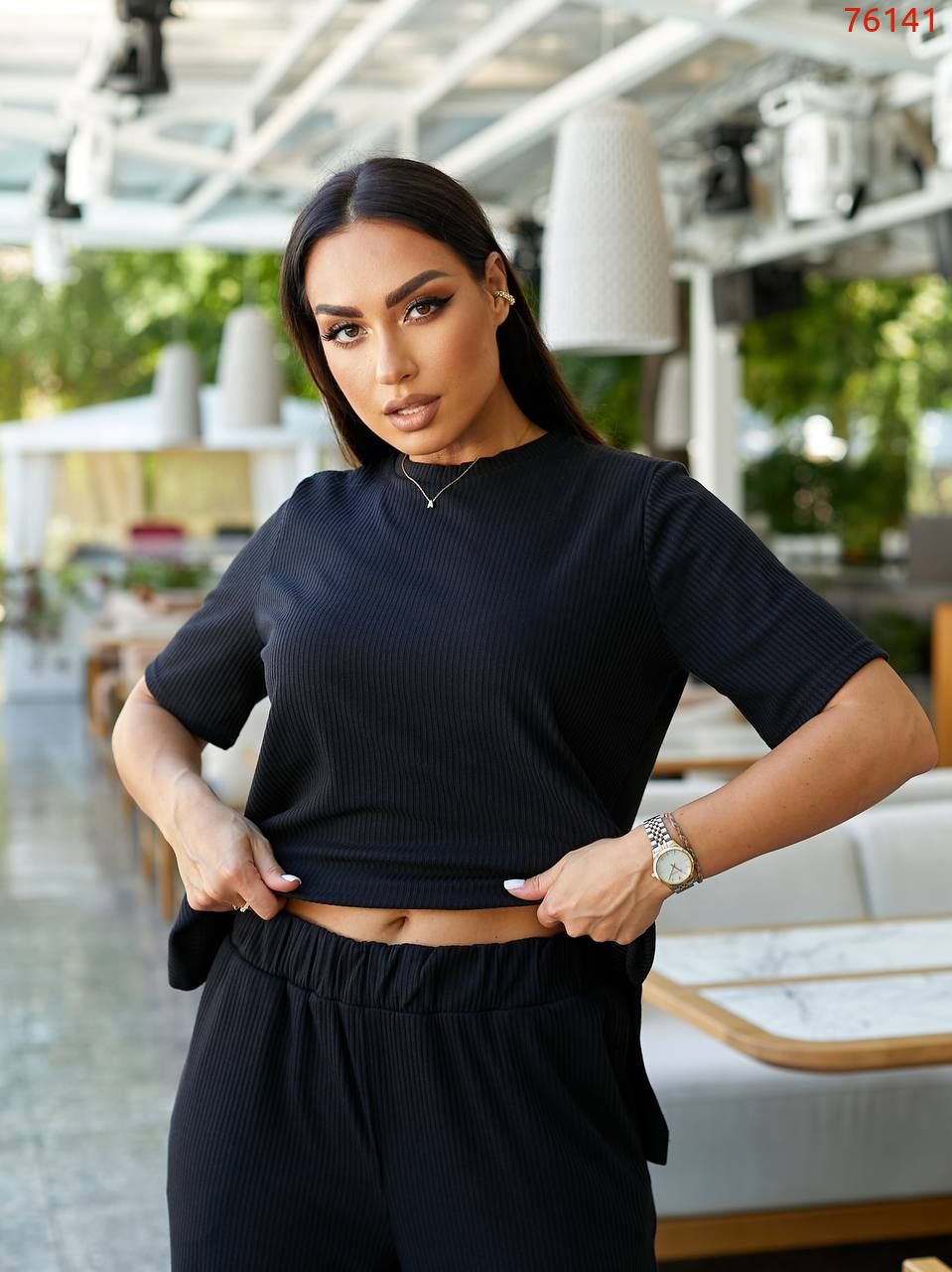 Деталі: подовжена футболка вільного крою з округлою горловиною та рукавом до ліктя. Брюки-палаццо на широкій резинці, з глибокими вмісткими кишенями.