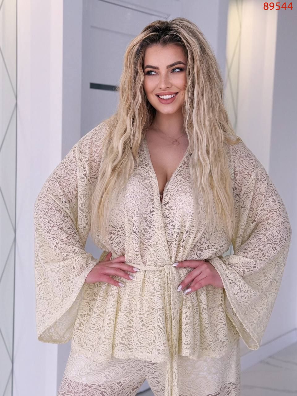В брюках вшита підкладка в виді шортиків. Довжина брюк 77/110. Пояс на гумці, висока посадка. Кардиган одягається на запах, підвʼязується поясом . Рукава внизу широкі, є знімни завʼязки, якими можна зробити іншу форму рукава, завʼязав їх.