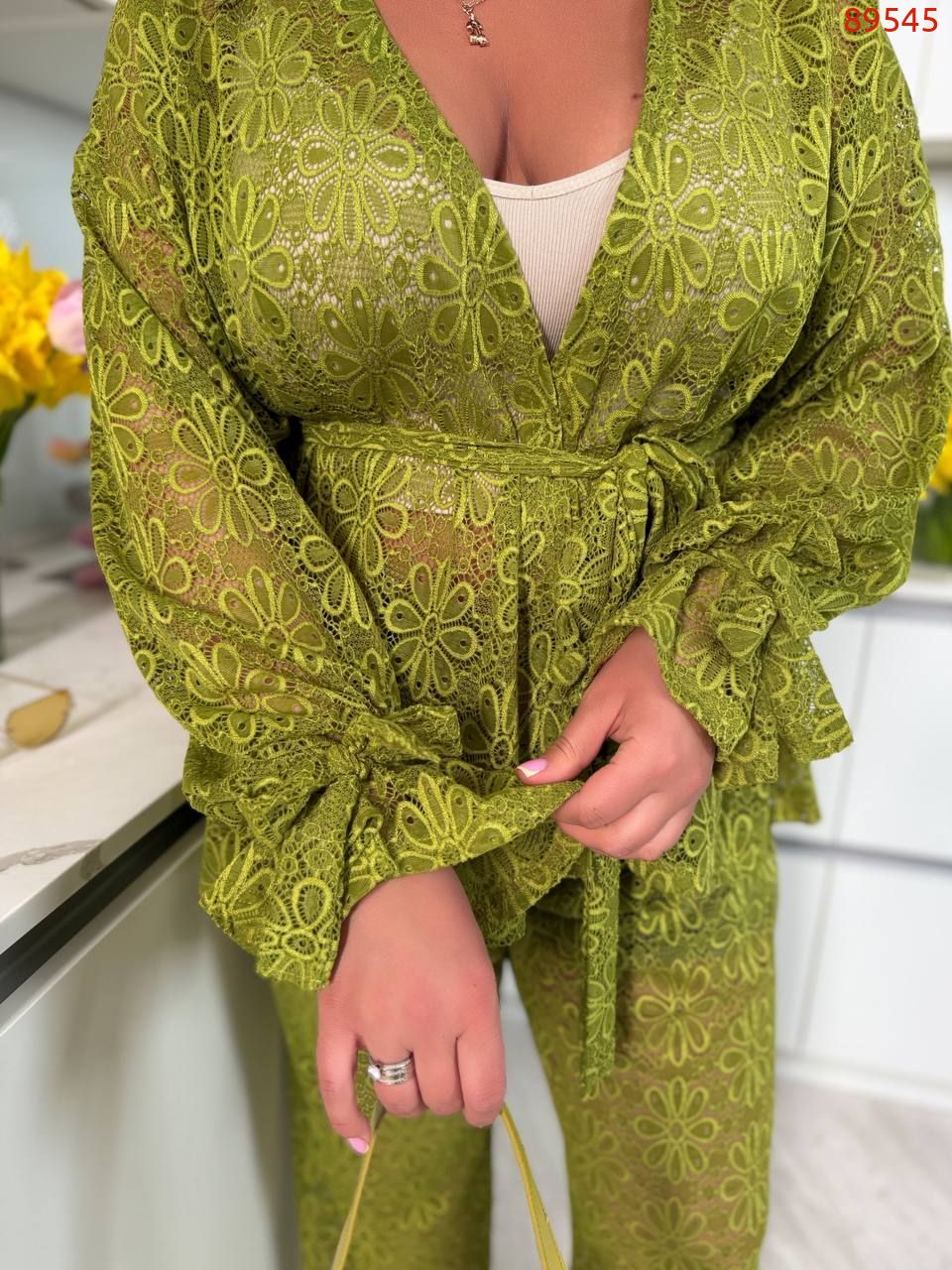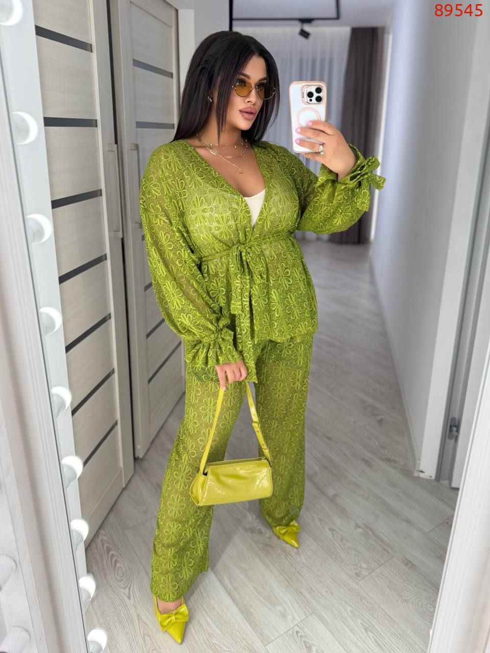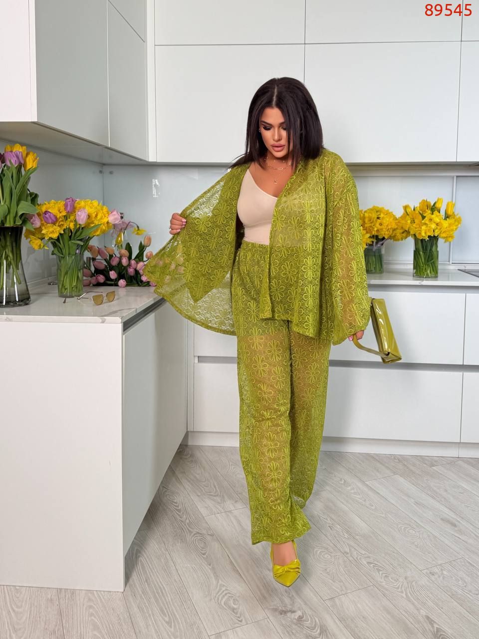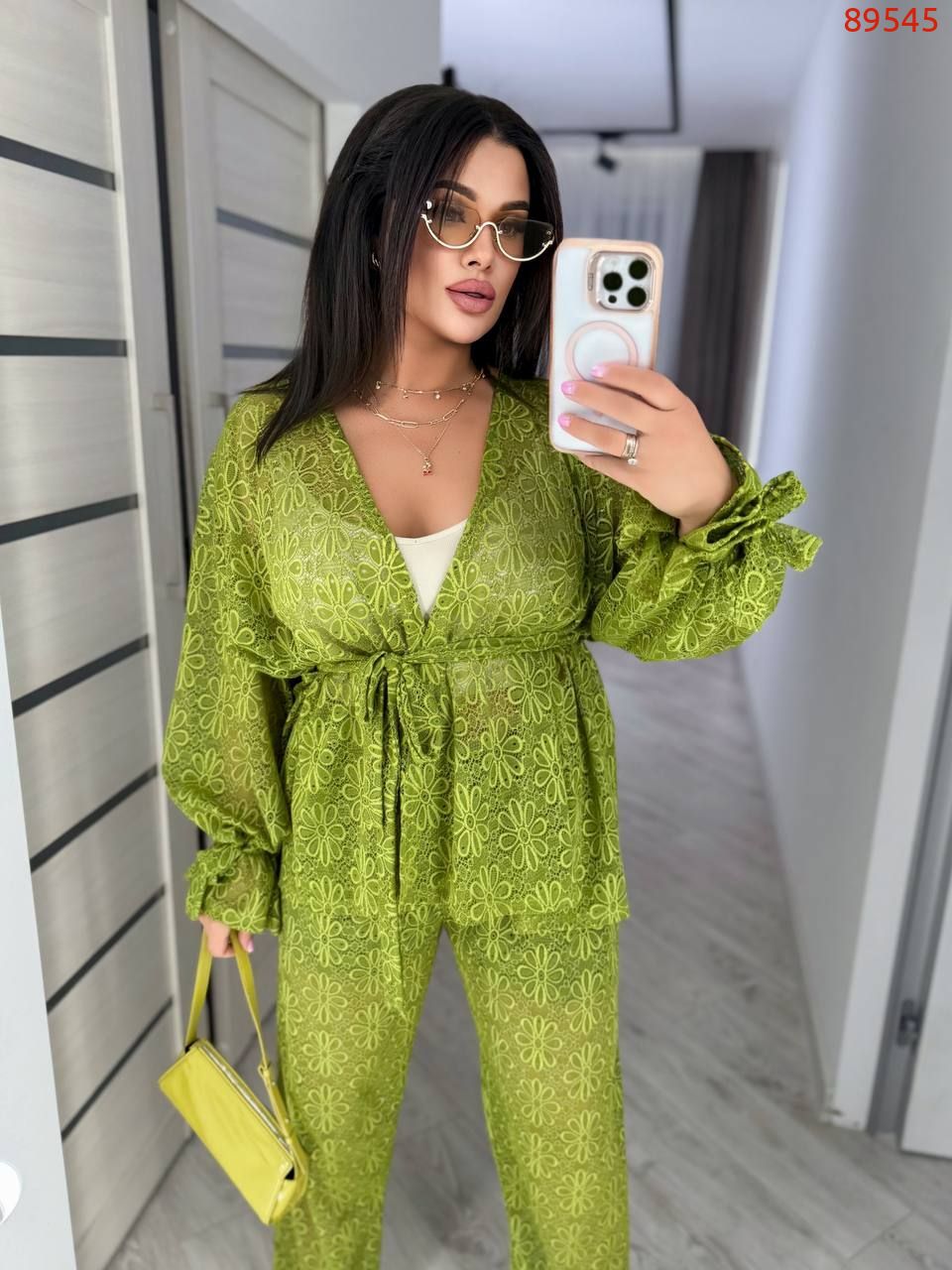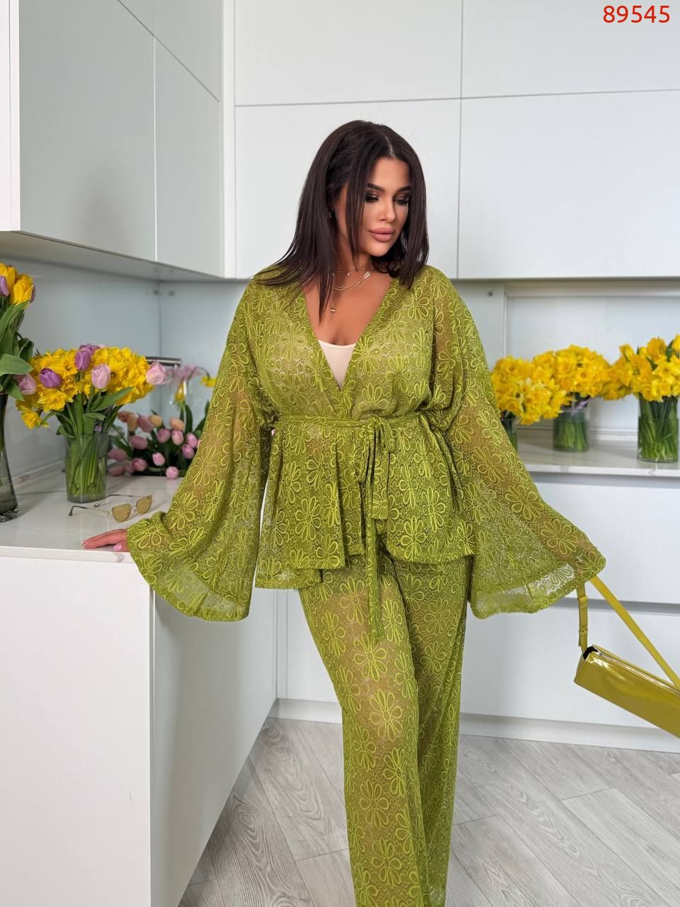 В брюках вшита підкладка в виді шортиків. Довжина брюк 77/110. Пояс на гумці, висока посадка. Кардиган одягається на запах, підвʼязується поясом . Рукава внизу широкі, є знімни завʼязки, якими можна зробити іншу форму рукава, завʼязав їх.