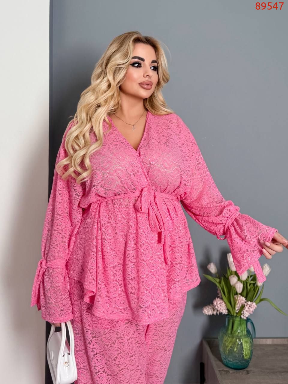 В брюках вшита підкладка в виді шортиків. Довжина брюк 77/110. Пояс на гумці, висока посадка. Кардиган одягається на запах, підвʼязується поясом . Рукава внизу широкі, є знімни завʼязки, якими можна зробити іншу форму рукава, завʼязав їх.