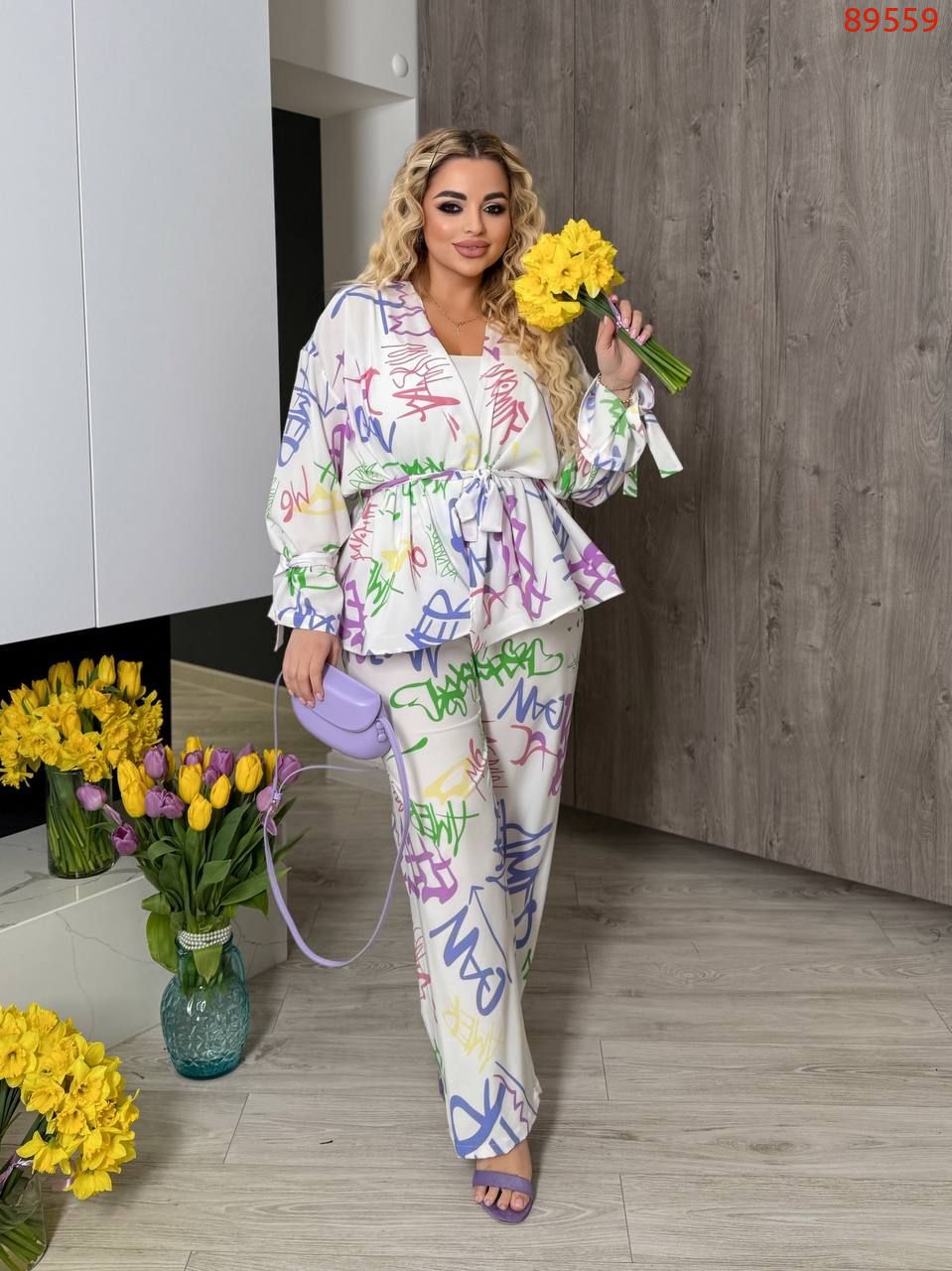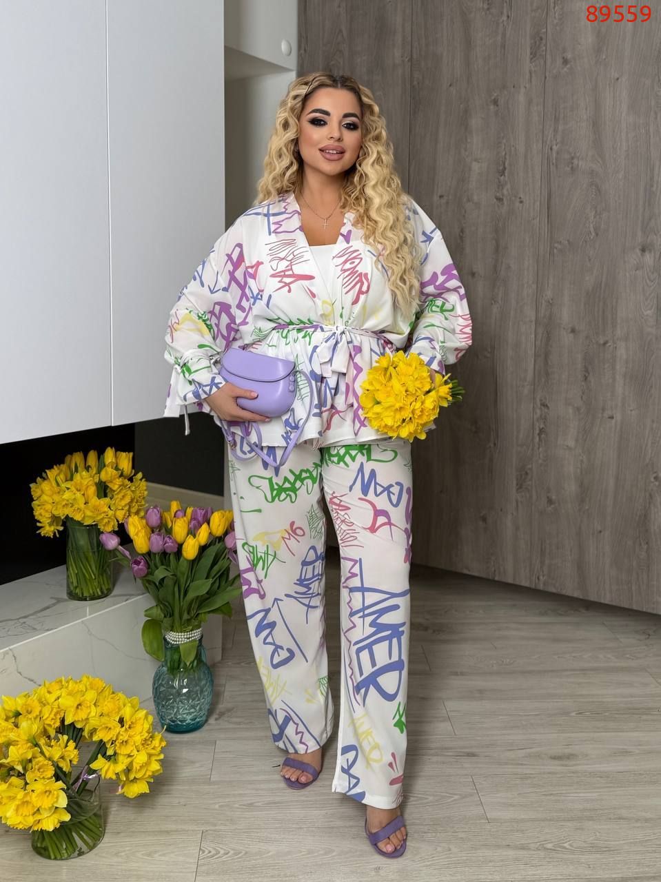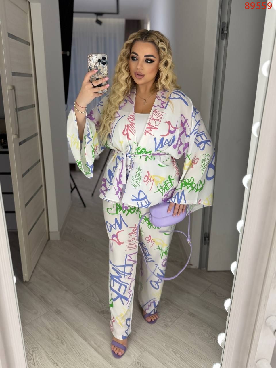 Довжина брюк 77/110. Пояс на гумці, висока посадка. Кардиган одягається на запах, підвʼязується поясом