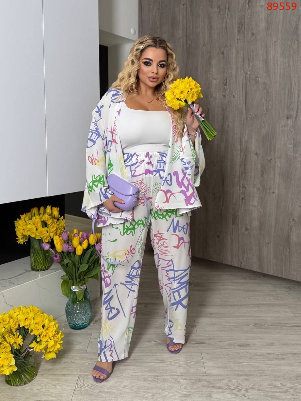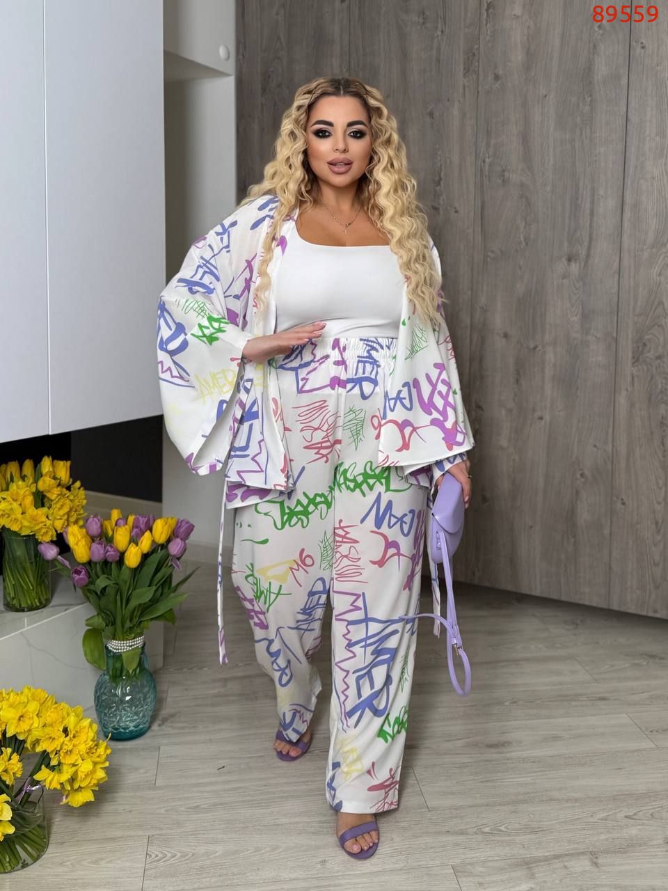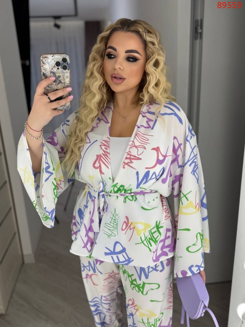 Довжина брюк 77/110. Пояс на гумці, висока посадка. Кардиган одягається на запах, підвʼязується поясом