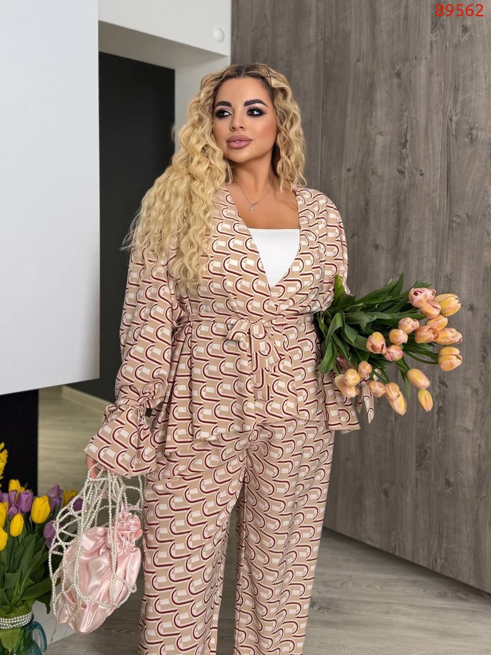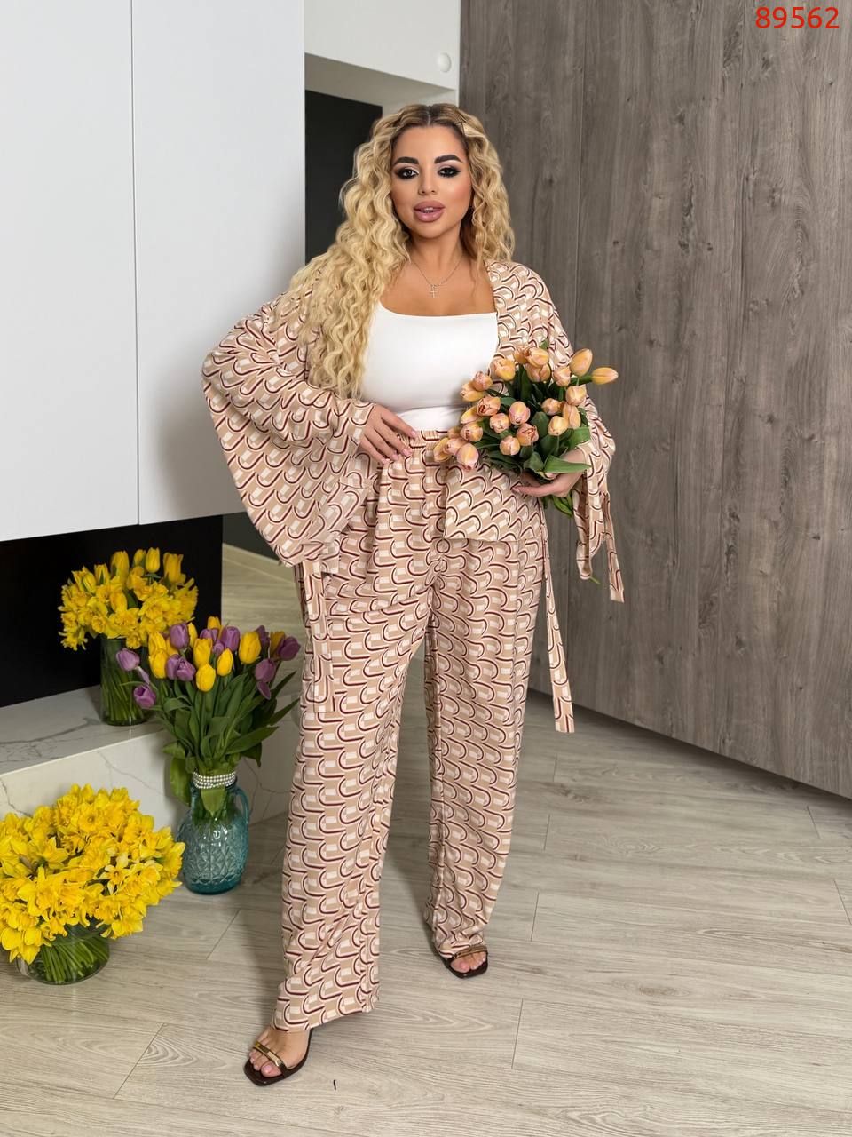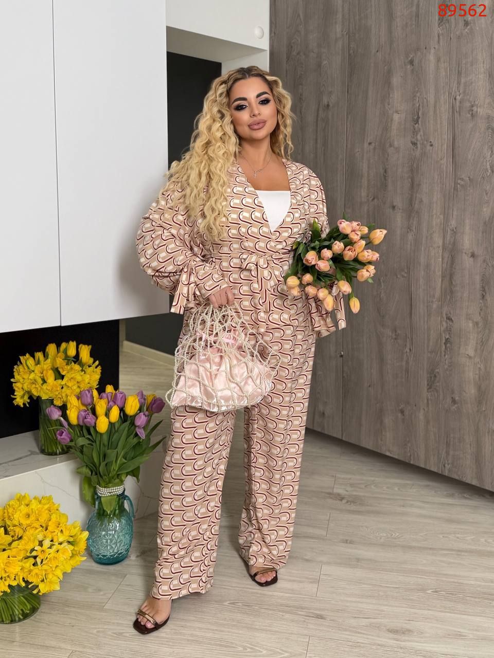 Тканина: софт-шовк (легка, приємна на дотик, мало мнущаяся тканина). Довжина брюк 77/110. Пояс на гумці, висока посадка. Кардиган одягається на запах, підвʼязується поясом . Рукава внизу широкі, є знімни завʼязки, якими можна зробити іншу форму рукава завʼязав їх.