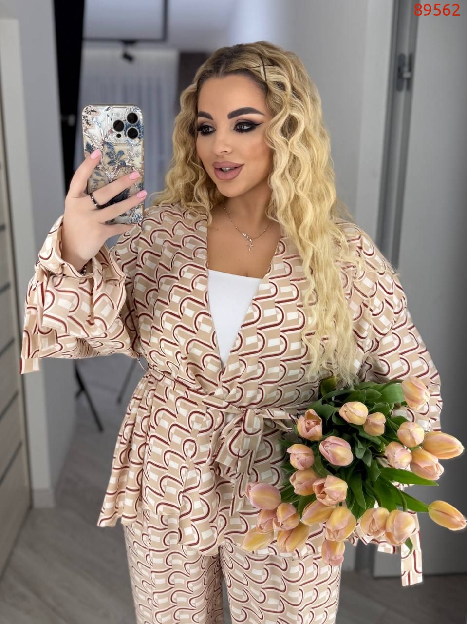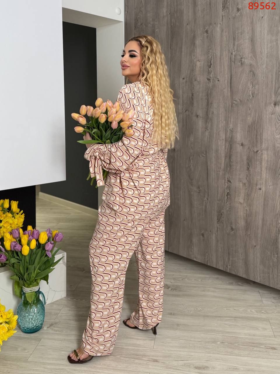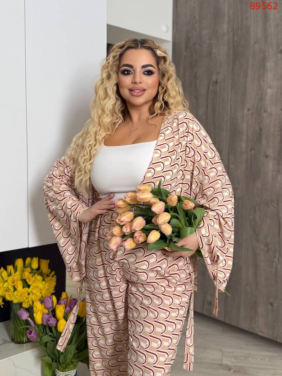 Тканина: софт-шовк (легка, приємна на дотик, мало мнущаяся тканина). Довжина брюк 77/110. Пояс на гумці, висока посадка. Кардиган одягається на запах, підвʼязується поясом . Рукава внизу широкі, є знімни завʼязки, якими можна зробити іншу форму рукава завʼязав їх.