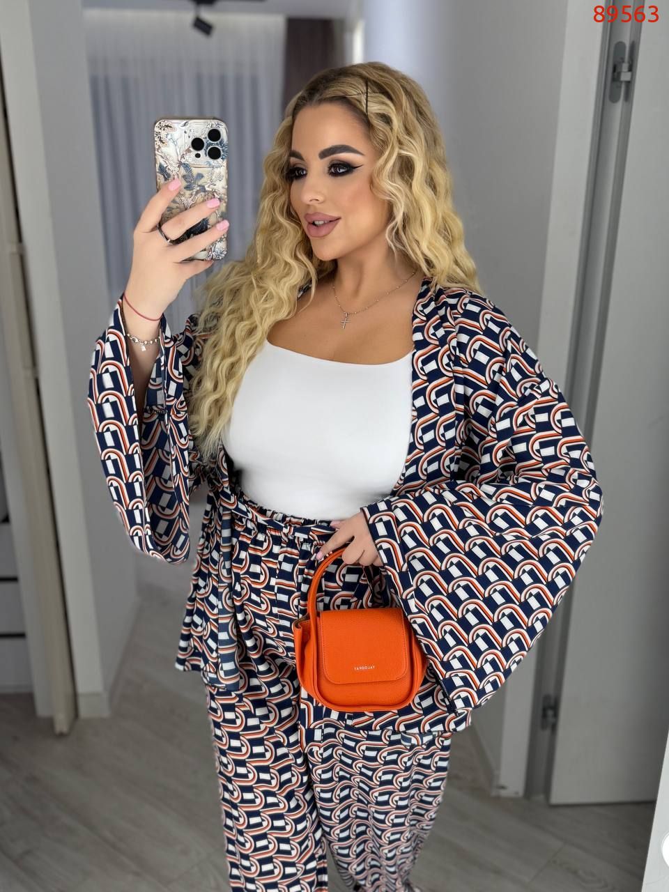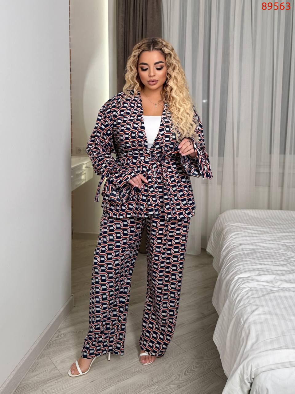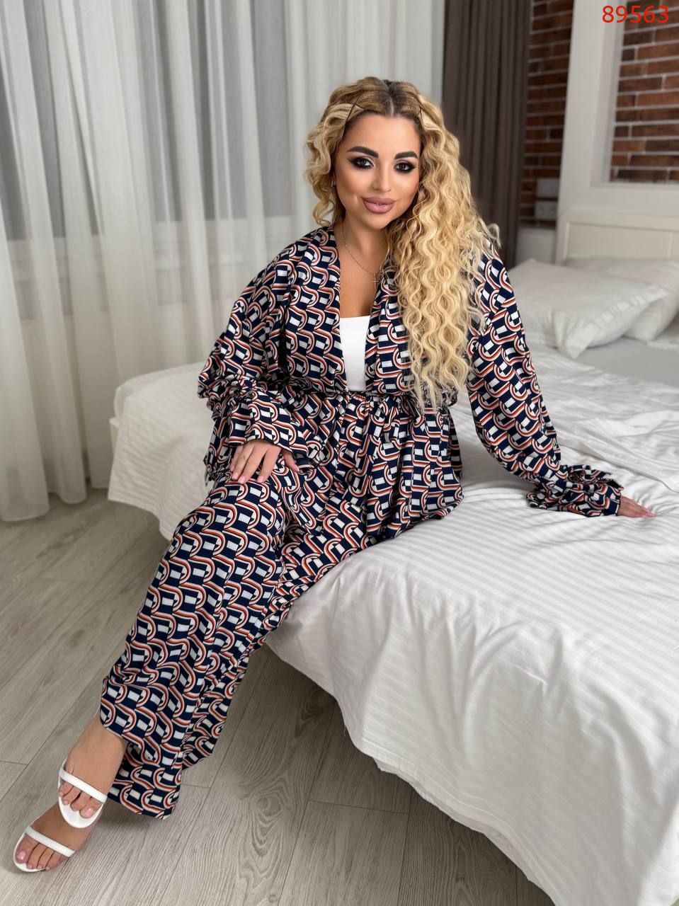Тканина: софт-шовк (легка, приємна на дотик, мало мнущаяся тканина). Довжина брюк 77/110. Пояс на гумці, висока посадка. Кардиган одягається на запах, підвʼязується поясом . Рукава внизу широкі, є знімни завʼязки, якими можна зробити іншу форму рукава завʼязав їх.