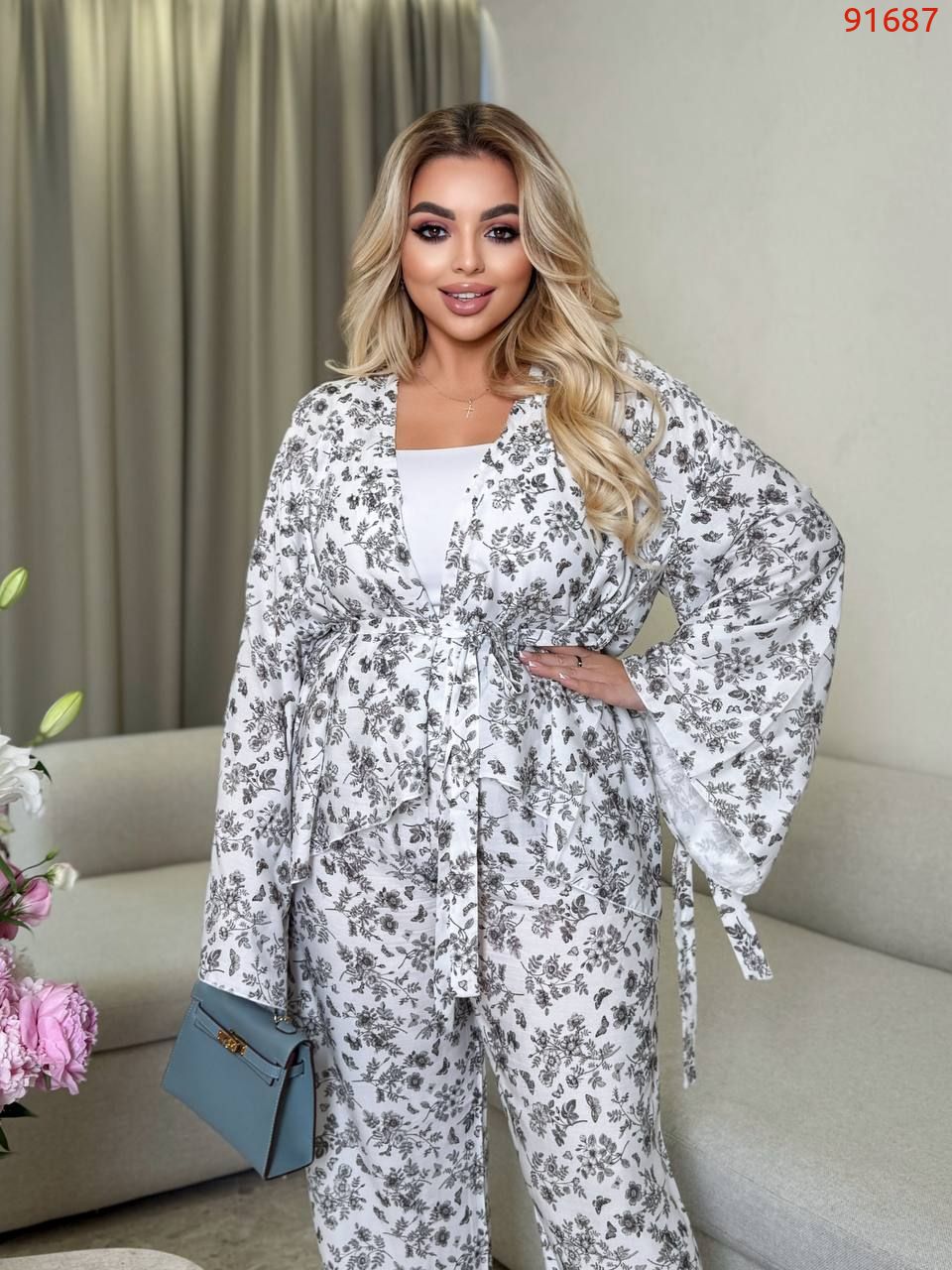Довжина брюк 77/110. Пояс на гумці, висока посадка. Кардиган одягається на запах, підвʼязується поясом . Рукава внизу широкі, є знімни завʼязки, якими можна зробити іншу форму рукава завʼязав їх. Заміри по виробу: