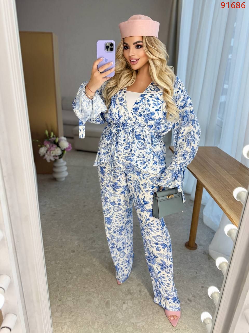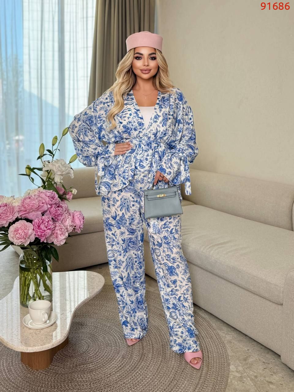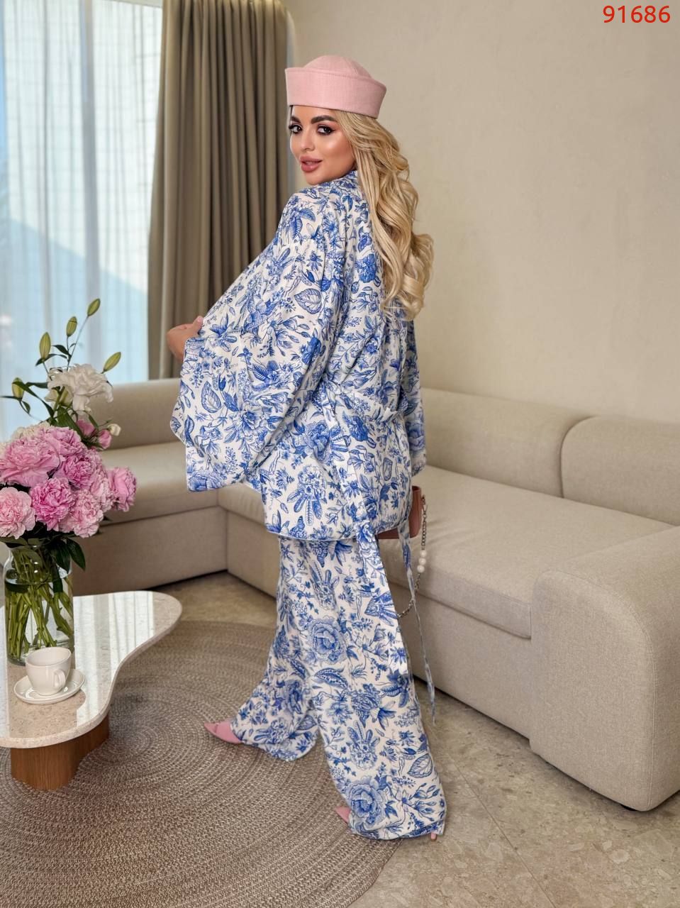 Довжина брюк 77/110. Пояс на гумці, висока посадка. Кардиган одягається на запах, підвʼязується поясом . Рукава внизу широкі, є знімни завʼязки, якими можна зробити іншу форму рукава завʼязав їх. Заміри по виробу: