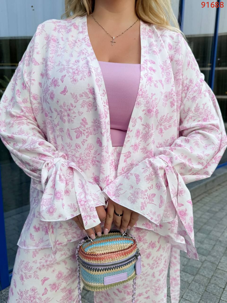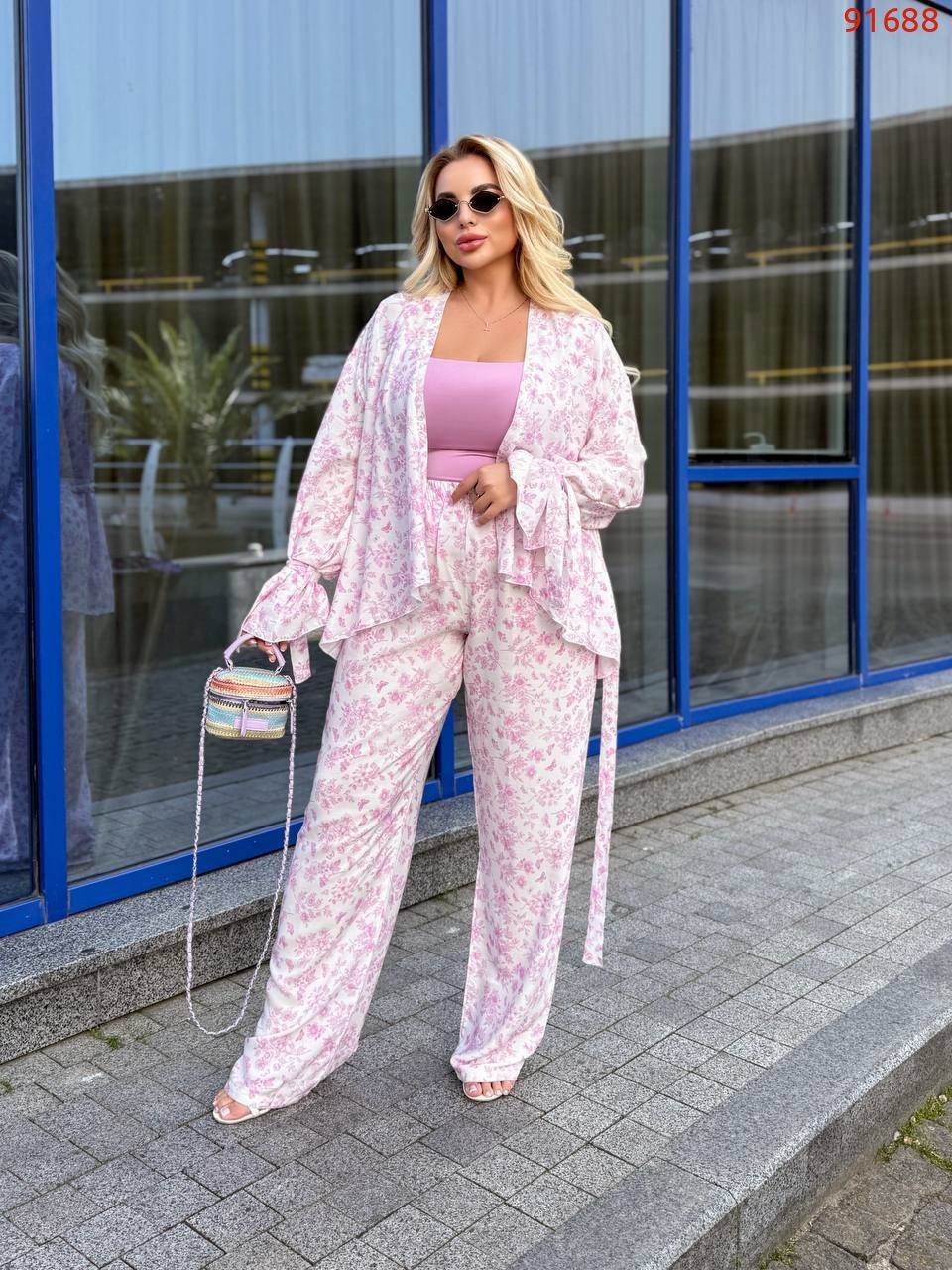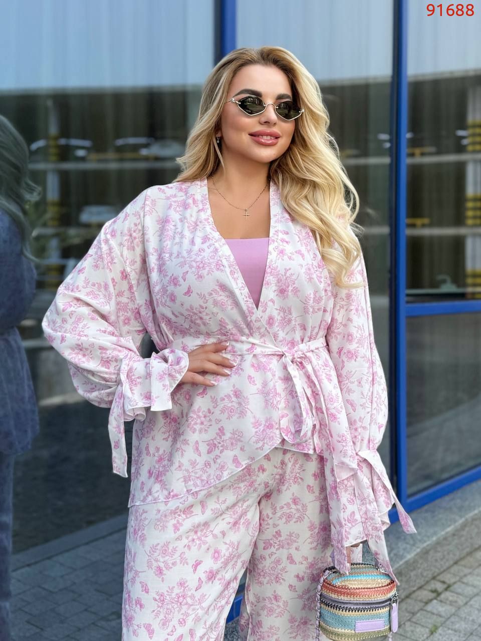 Довжина брюк 77/110. Пояс на гумці, висока посадка. Кардиган одягається на запах, підвʼязується поясом . Рукава внизу широкі, є знімни завʼязки, якими можна зробити іншу форму рукава завʼязав їх. Заміри по виробу: