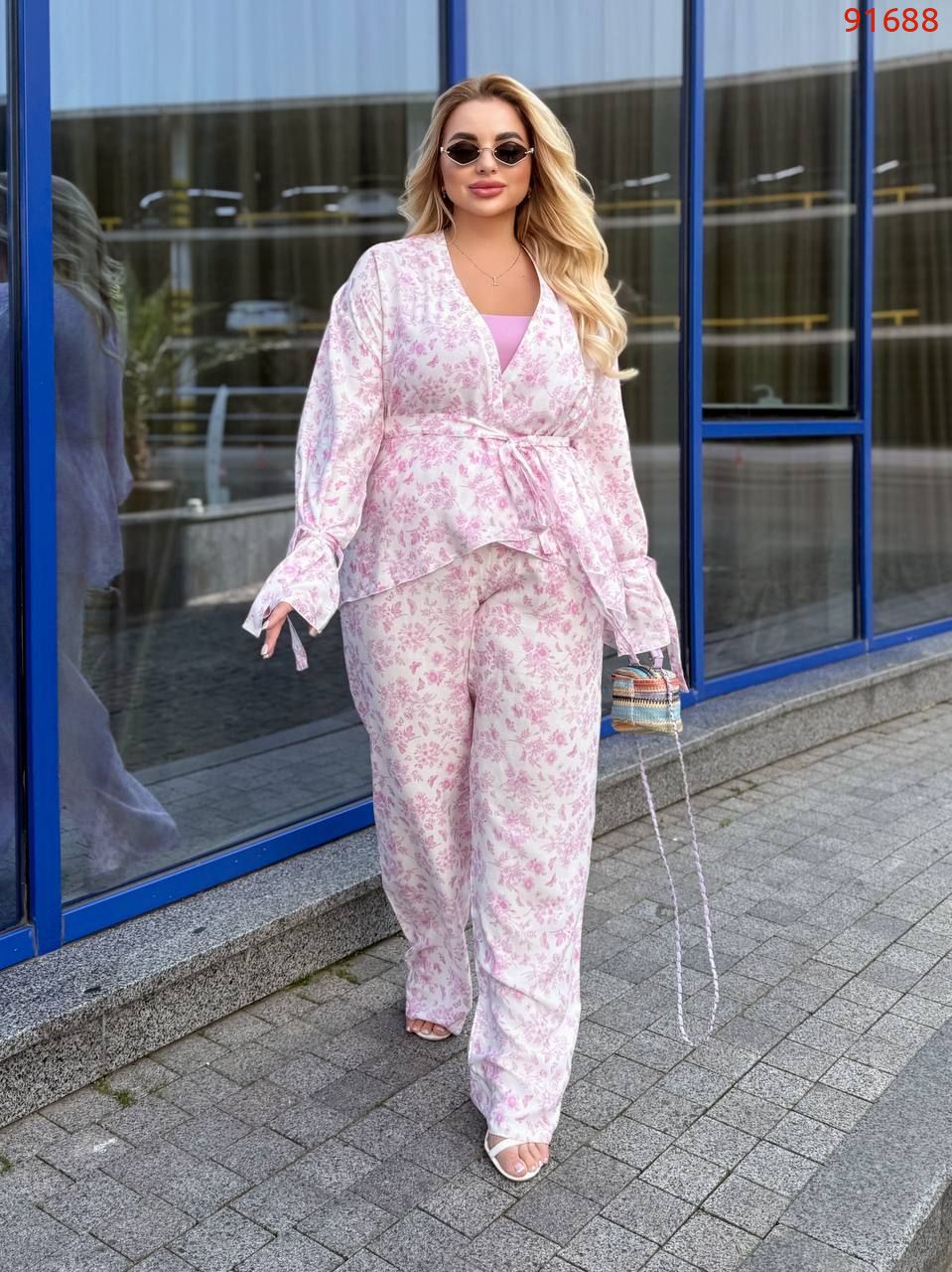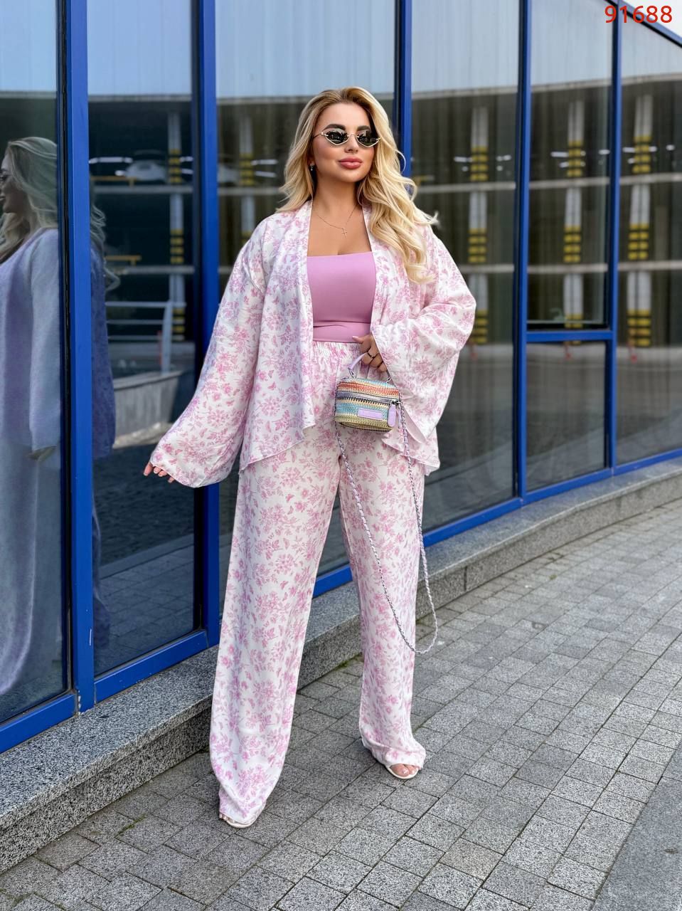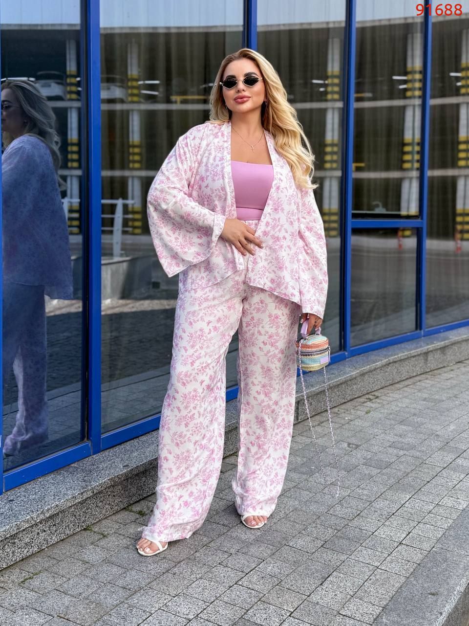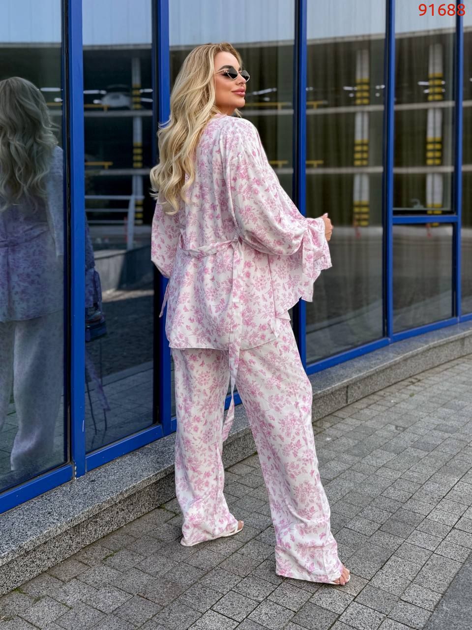 Довжина брюк 77/110. Пояс на гумці, висока посадка. Кардиган одягається на запах, підвʼязується поясом . Рукава внизу широкі, є знімни завʼязки, якими можна зробити іншу форму рукава завʼязав їх. Заміри по виробу: