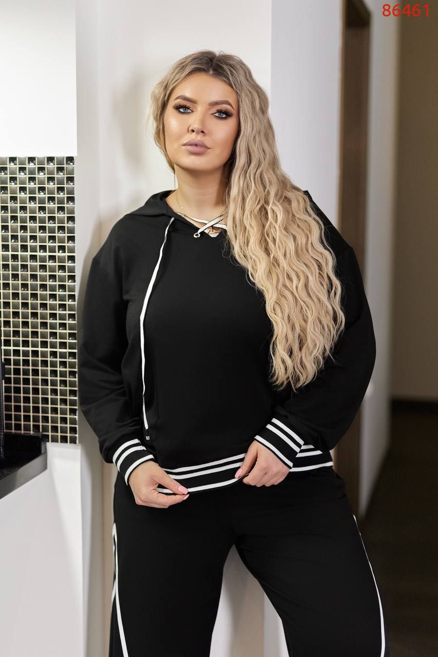 Худі вільного крою з капюшоном, на грудях має шнуровку , низ худі і манжети прикрашені рибаною, штани високої посадки з бічними кишенями, вільного крою.