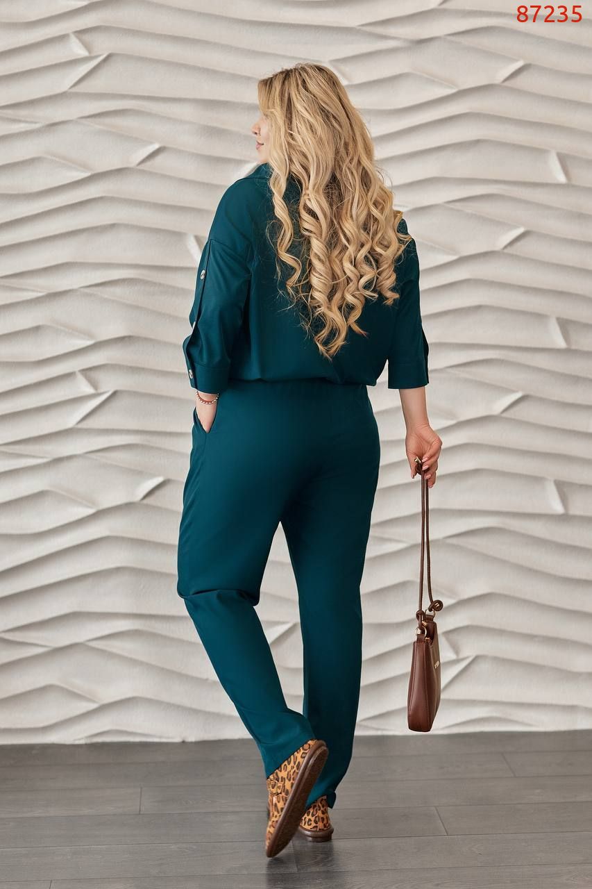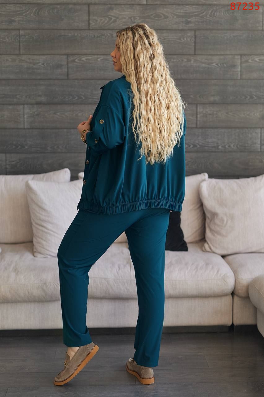 Жакет вільного крою з незвичайними деталями, зі спущеною лінією плеча і рукавом три чверті,на грудях прикрашен клапанами , застібається на ґудзики,в рельєфних швах спереду-кишені, по низу жакета - гумка. Брюки в талії по спинці на гумці, спереду в поясі застібаються на гудзик і блискавку, високої посадки ,з кишенями.