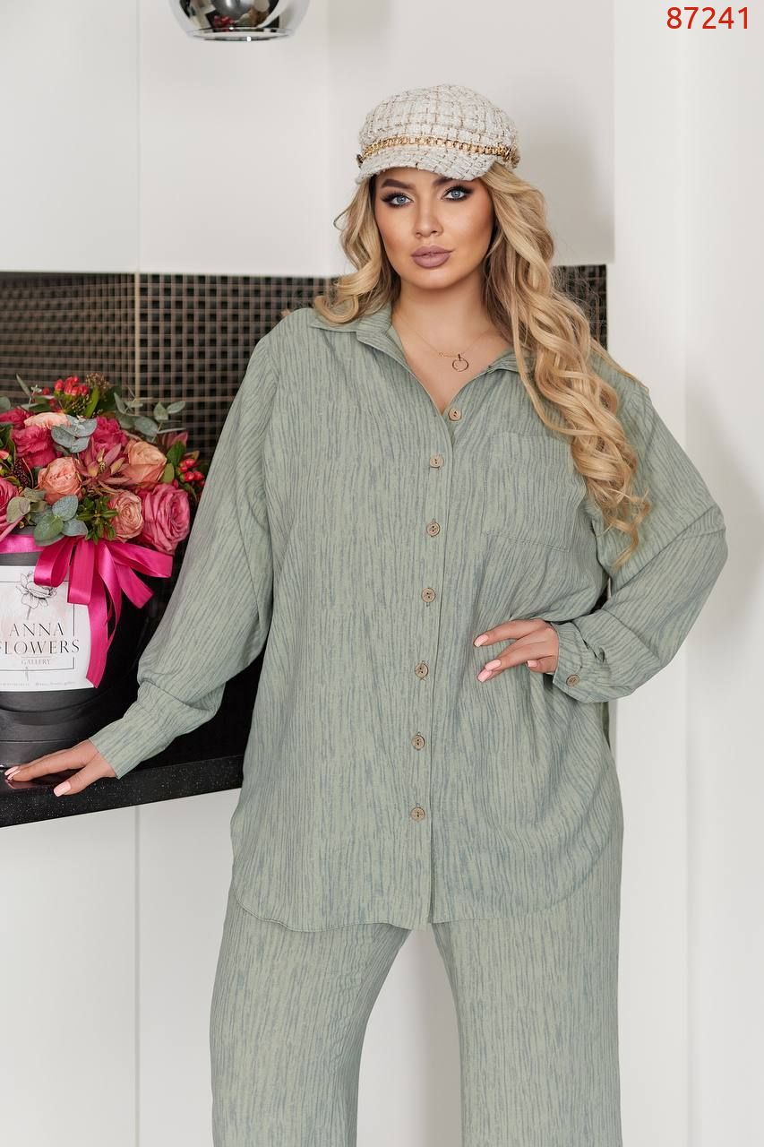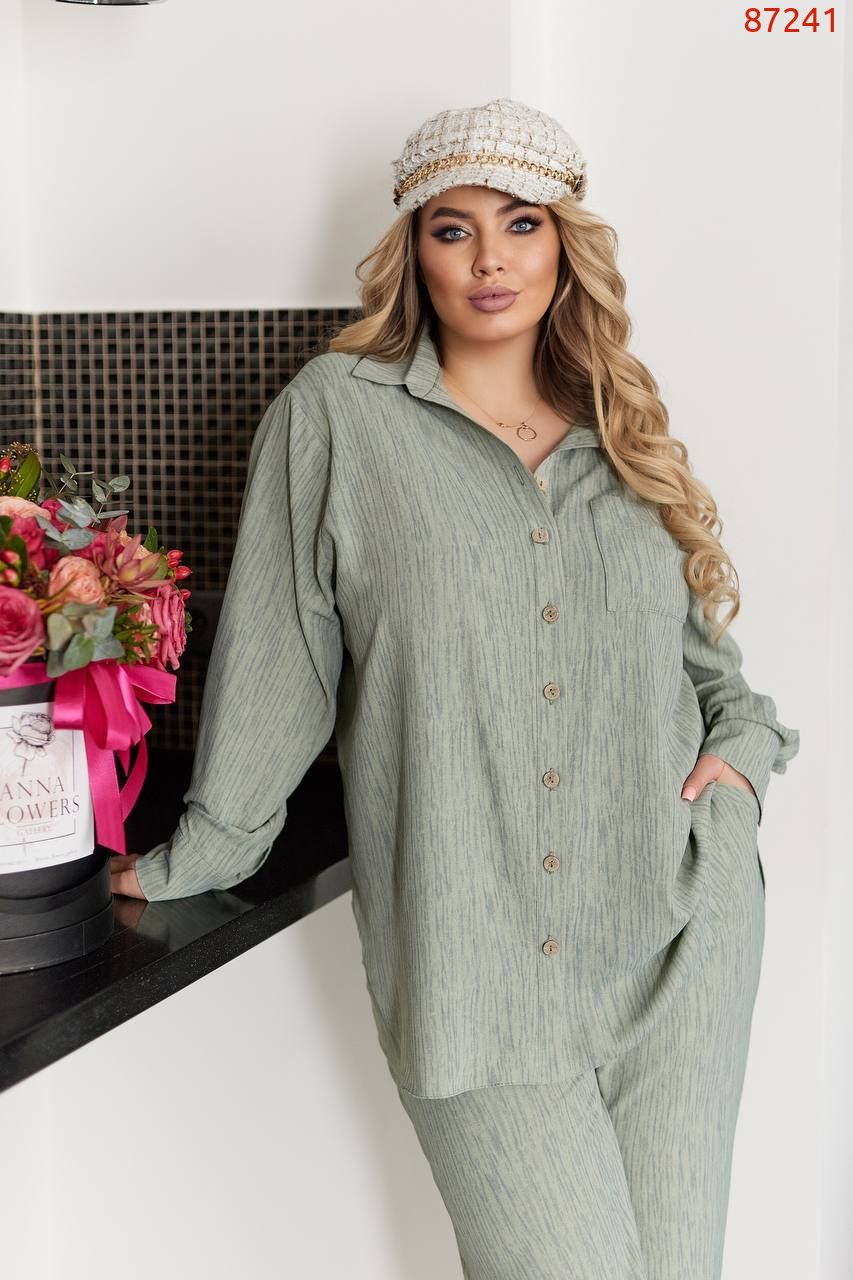 У костюмі сорочка вільна, з кишенею на грудях, має спущений рукав з манжетом, застібається на ґудзики. Брюки вільного крою, високої посадки,в талії на гумці і з кишенями.