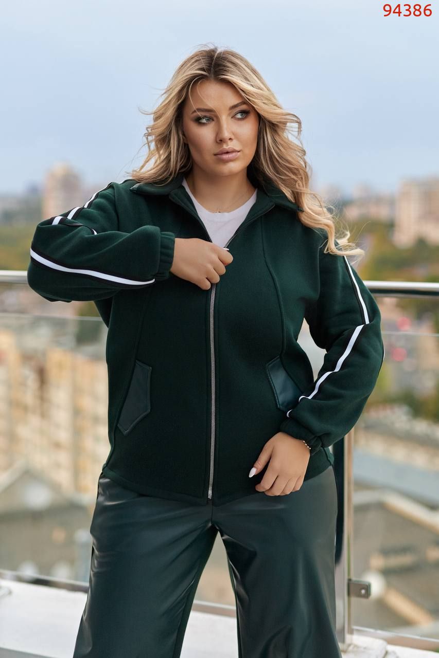 Кофта вільного крою, комір з бічними кишенями декоровані шкірою, з застібкою на блискавці, лампаси на рукавах,довгий спущений рукав, манжети на резинці. Брюки: висока посадка,прямий вільний крій, спереду вставки зі штучної шкіри, сзаду -тринитка, пояс на резинці, лампаси з боків.