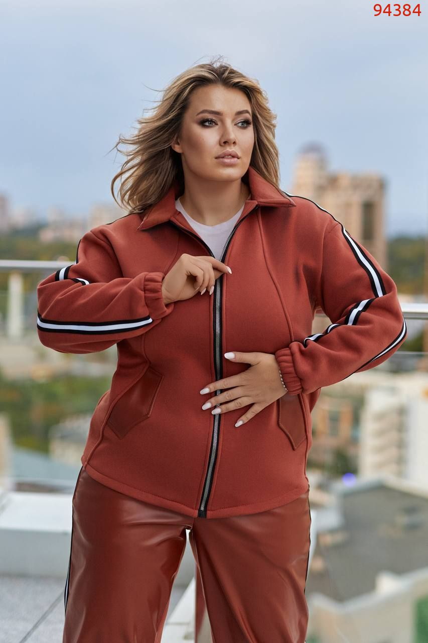Кофта вільного крою, комір з бічними кишенями декоровані шкірою, з застібкою на блискавці, лампаси на рукавах,довгий спущений рукав, манжети на резинці. Брюки: висока посадка,прямий вільний крій, спереду вставки зі штучної шкіри, сзаду -тринитка, пояс на резинці, лампаси з боків.