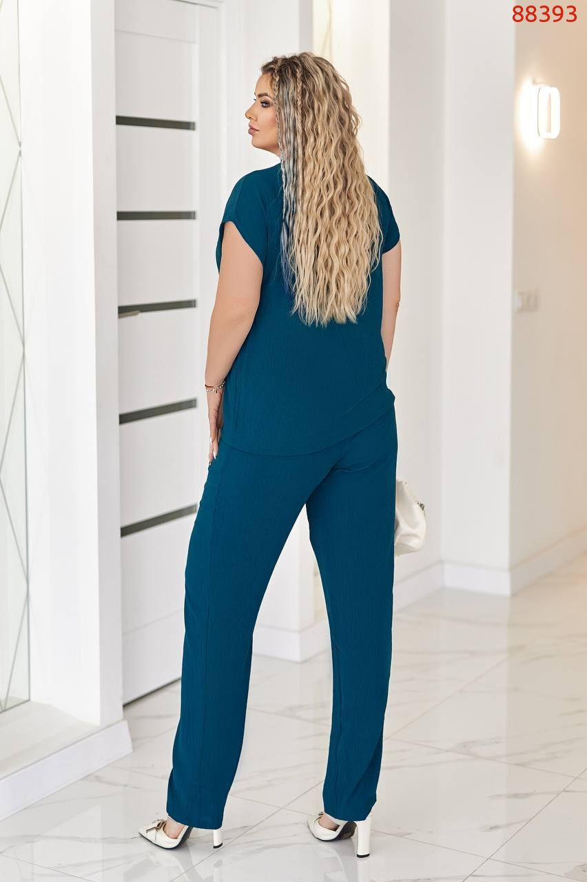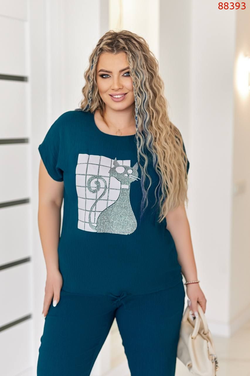 Блуза вільного крою з трендовим принтом, прикрашена стразами нереальної якості, камінчики сяють на променях світла. Блузка знизу на куліскі, можна затягнути, а також можна носити вільно. Брюки вільного крою, в талії на гумці, з карманами.