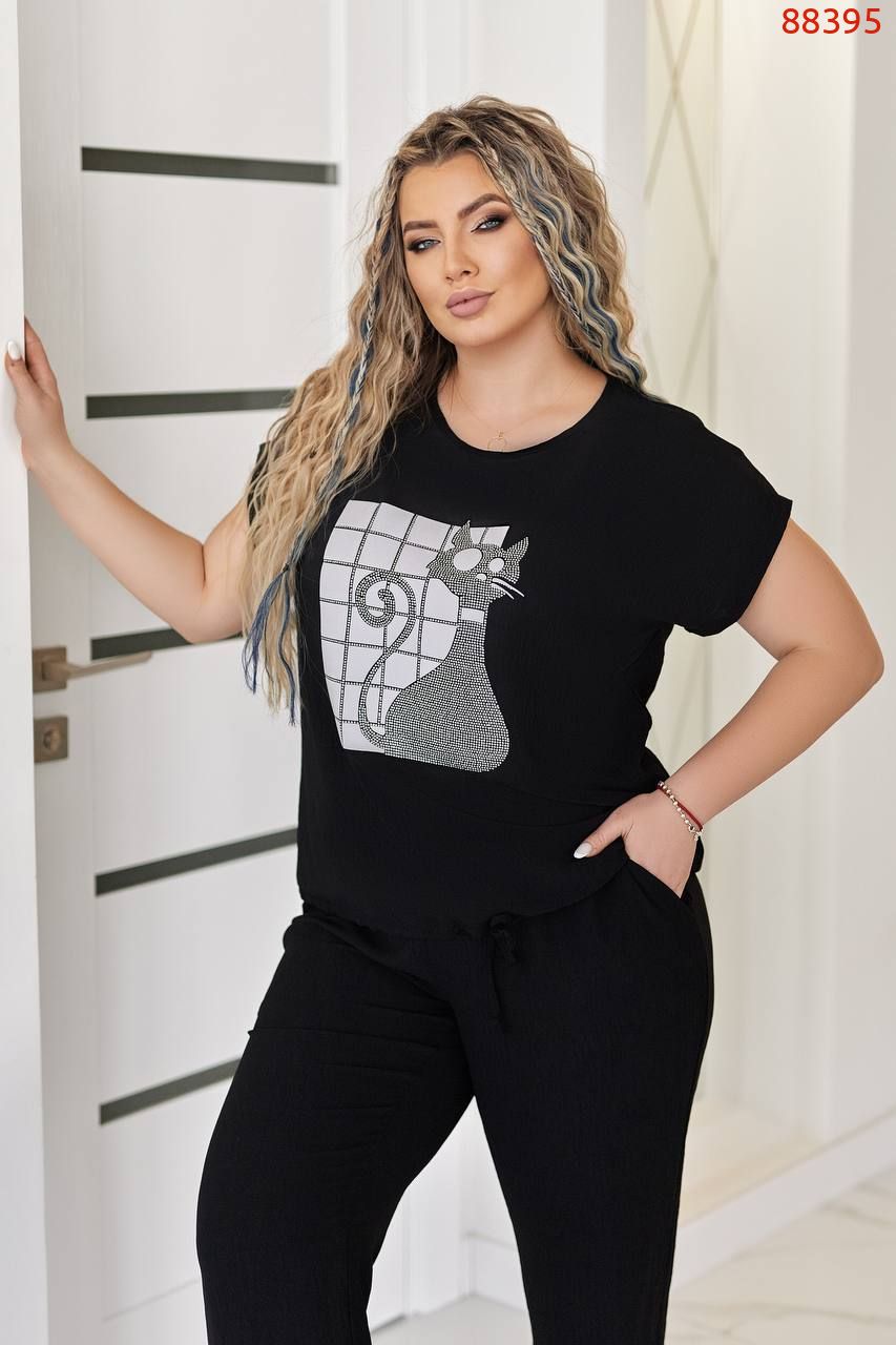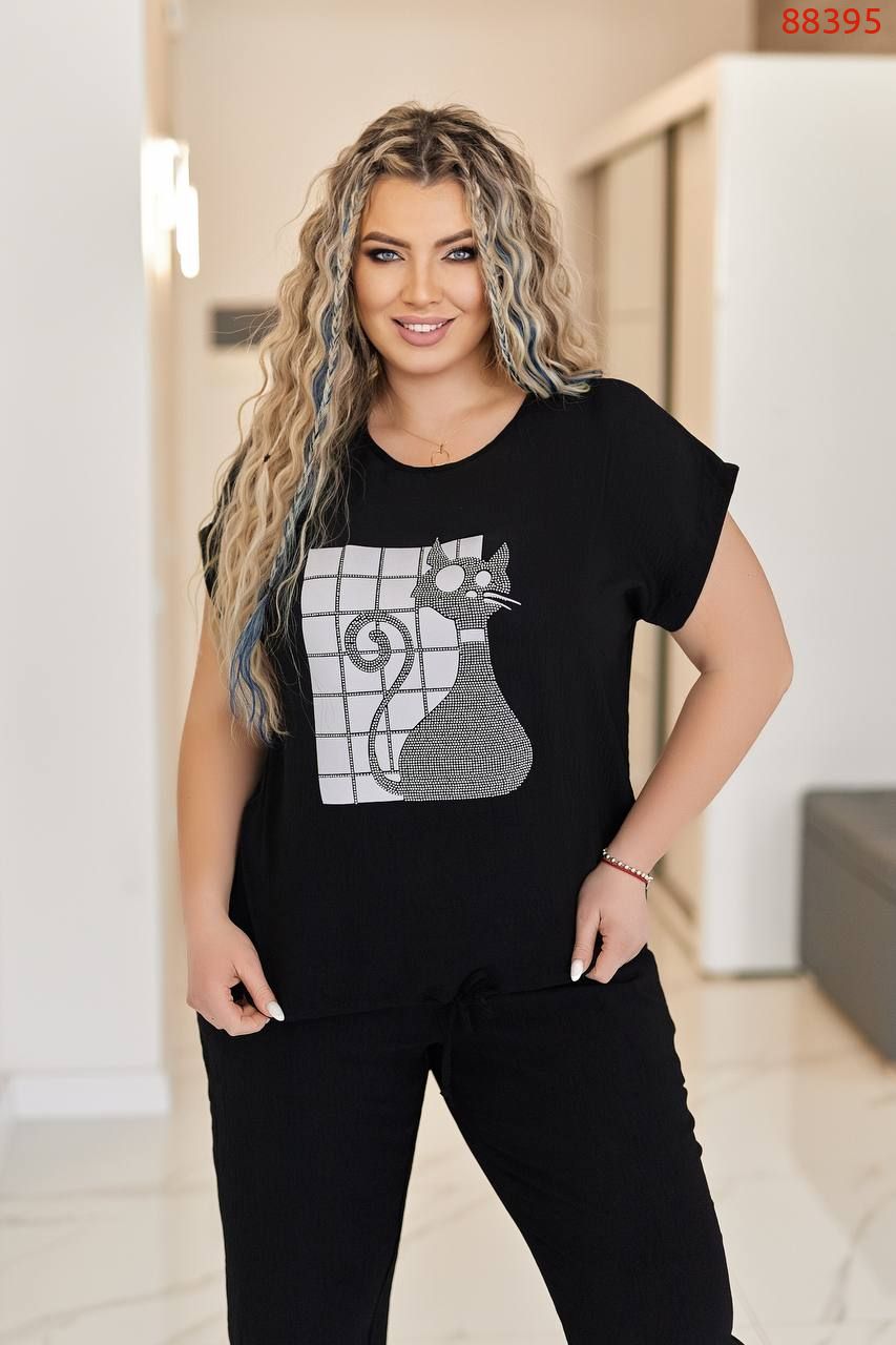 Блуза вільного крою з трендовим принтом, прикрашена стразами нереальної якості, камінчики сяють на променях світла. Блузка знизу на куліскі, можна затягнути, а також можна носити вільно. Брюки вільного крою, в талії на гумці, з карманами.