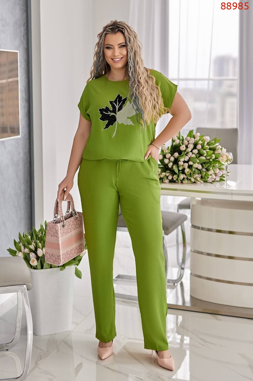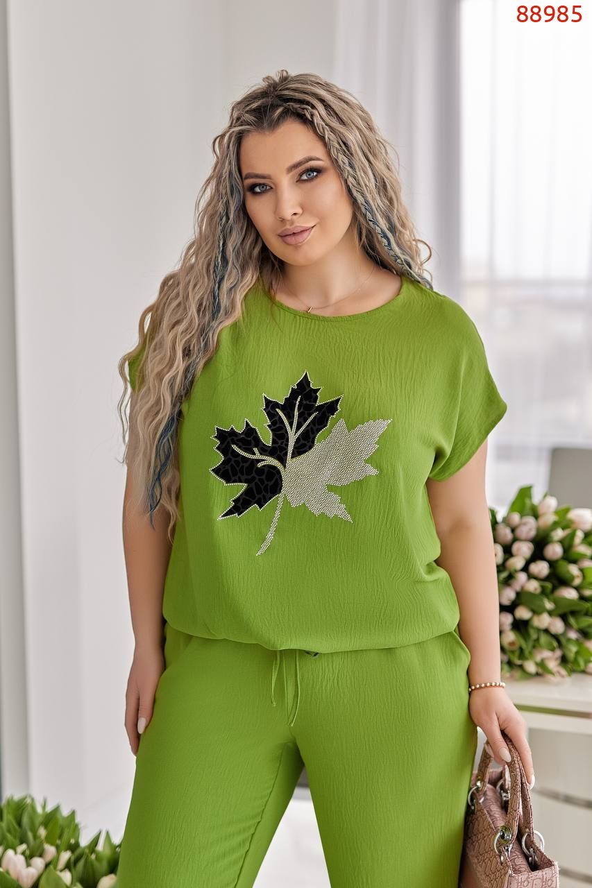 Блуза вільного крою з трендовим принтом, прикрашена стразами нереальної якості, камінчики сяють на променях світла. Блузка знизу на куліскі, можна затягнути, а також можна носити вільно. Брюки вільного крою, в талії на гумці, з карманами.