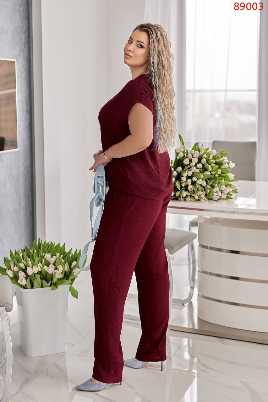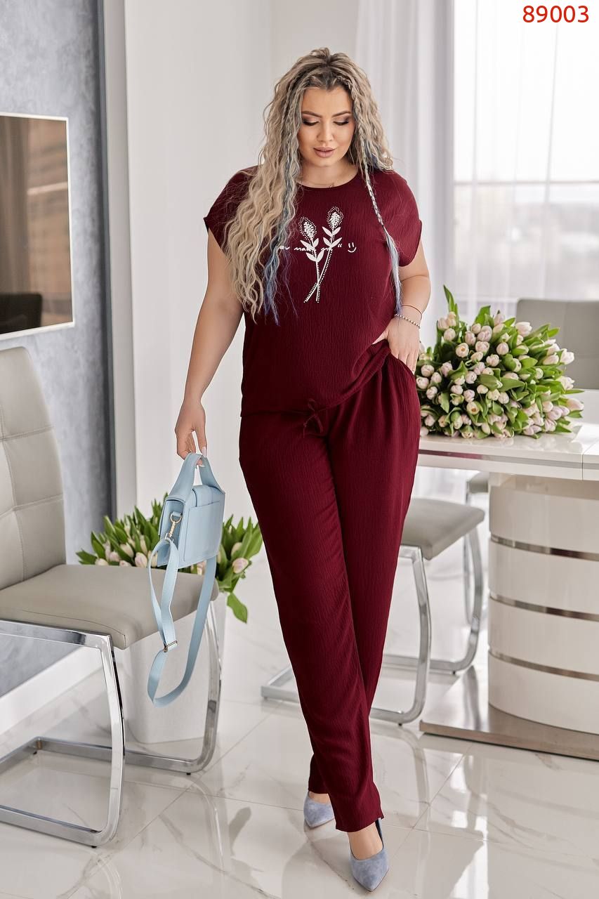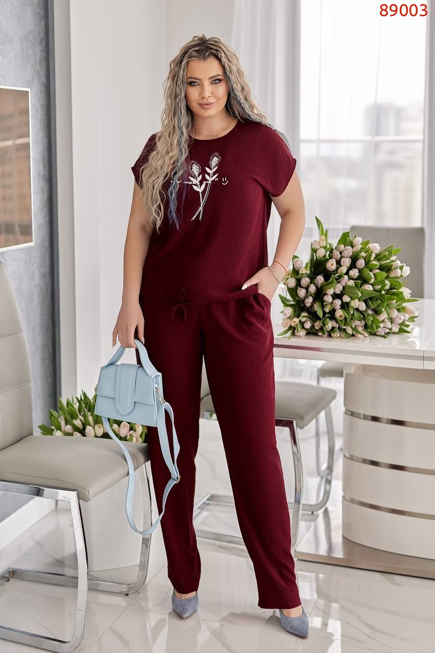 Блуза вільного крою з трендовим принтом, прикрашена стразами нереальної якості, камінчики сяють на променях світла. Блузка знизу на куліскі, можна затягнути, а також можна носити вільно. Брюки вільного крою, в талії на гумці, з карманами.