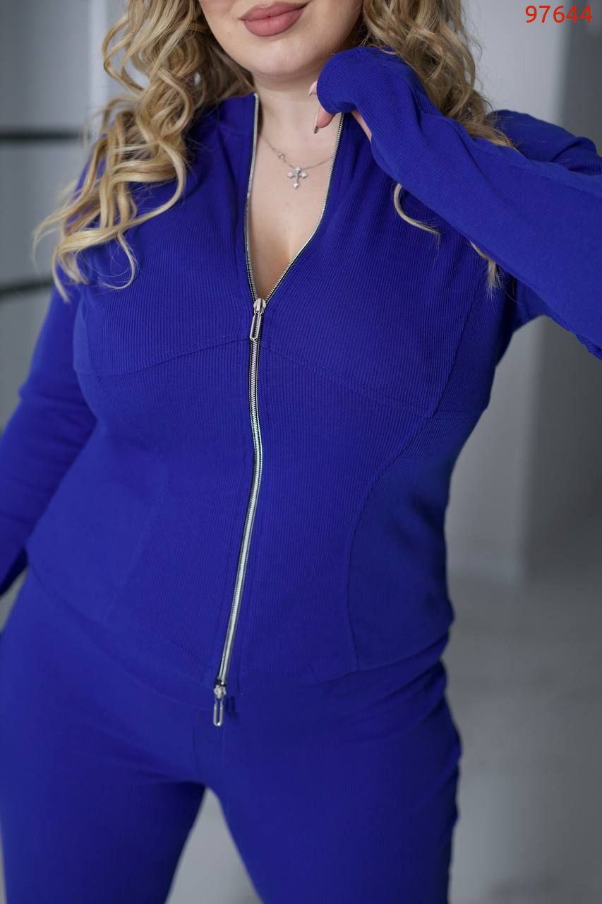 Стильний жіночий костюм-ідеальне поєднання комфорту та виразного силуету. Комплект складається з приталеної кофтинки на блискавці з двома бігунками і горловиною комір -стійка.Кофта з рельєфами красиво акцентує талію та груди, а подовжені манжети з вирізом під великий палець додають сучасного, спортивно-шикарного настрою. Брюки в талії на резинці, з високою посадкою та розкльошені від коліна , що візуально подовжують ноги й підкреслюють фігуру.