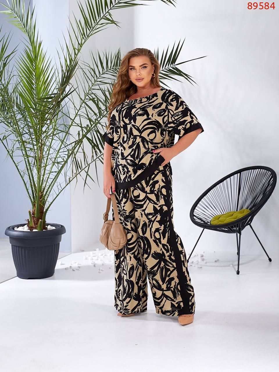 Літній брючний костюм з гарним принтом і благородним поєднанням кольорів ідеально підійде на літню спекотну погоду, як для повсякденного носіння, так і для урочистостей. Блуза «оверсайз» вільного силуету, з боків розрізи. Штани вільного силуету з високою посадкою, кишені.