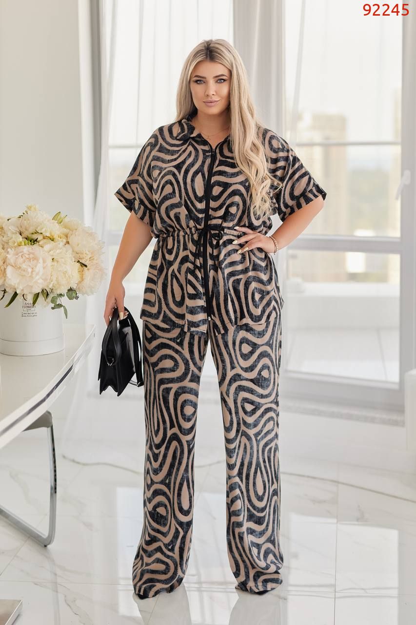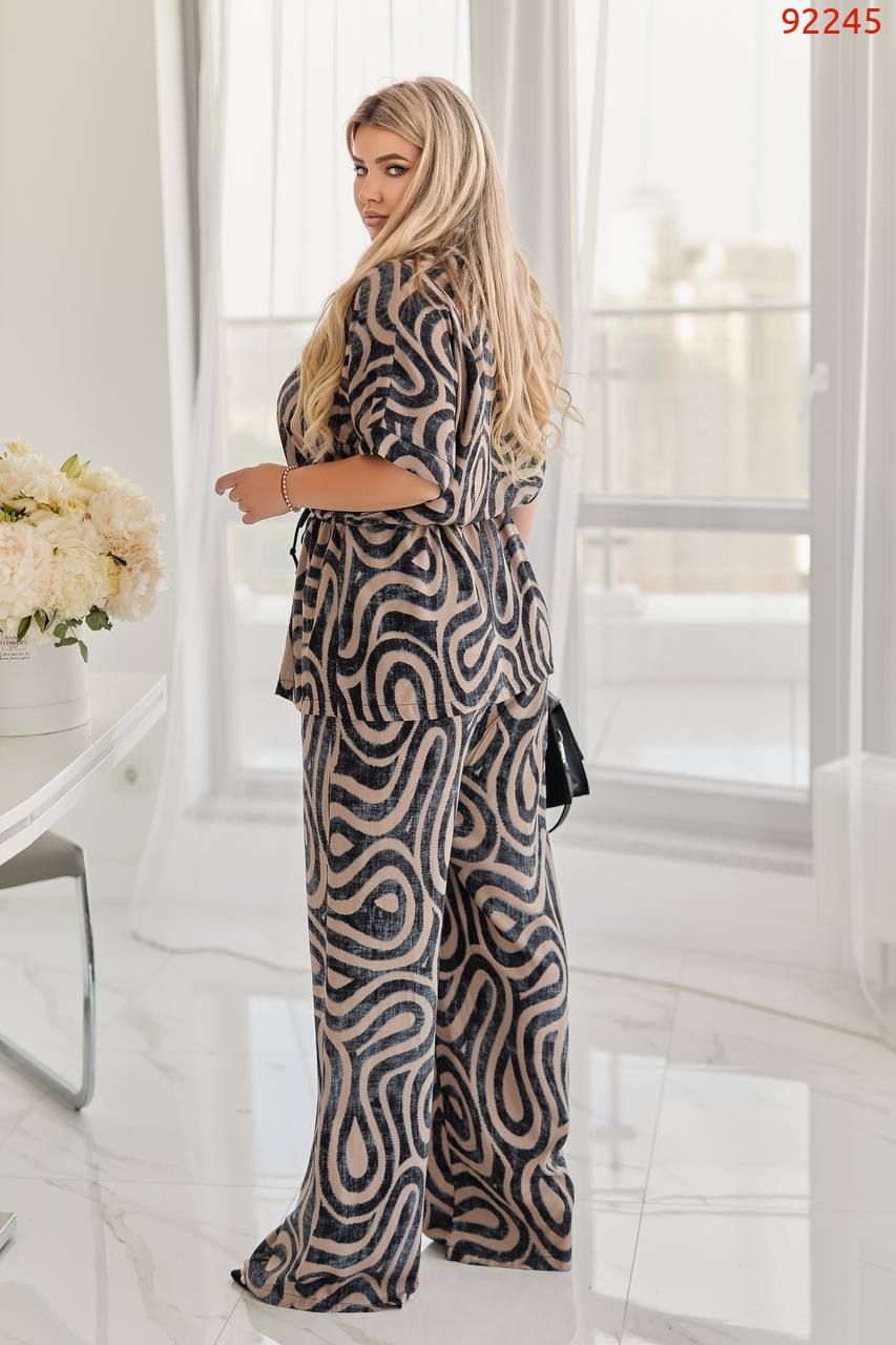 Літній брючний костюм з гарним принтом і благородним поєднанням кольорів ідеально підійде на літню спекотну погоду, як для повсякденного носіння, так і для урочистостей.