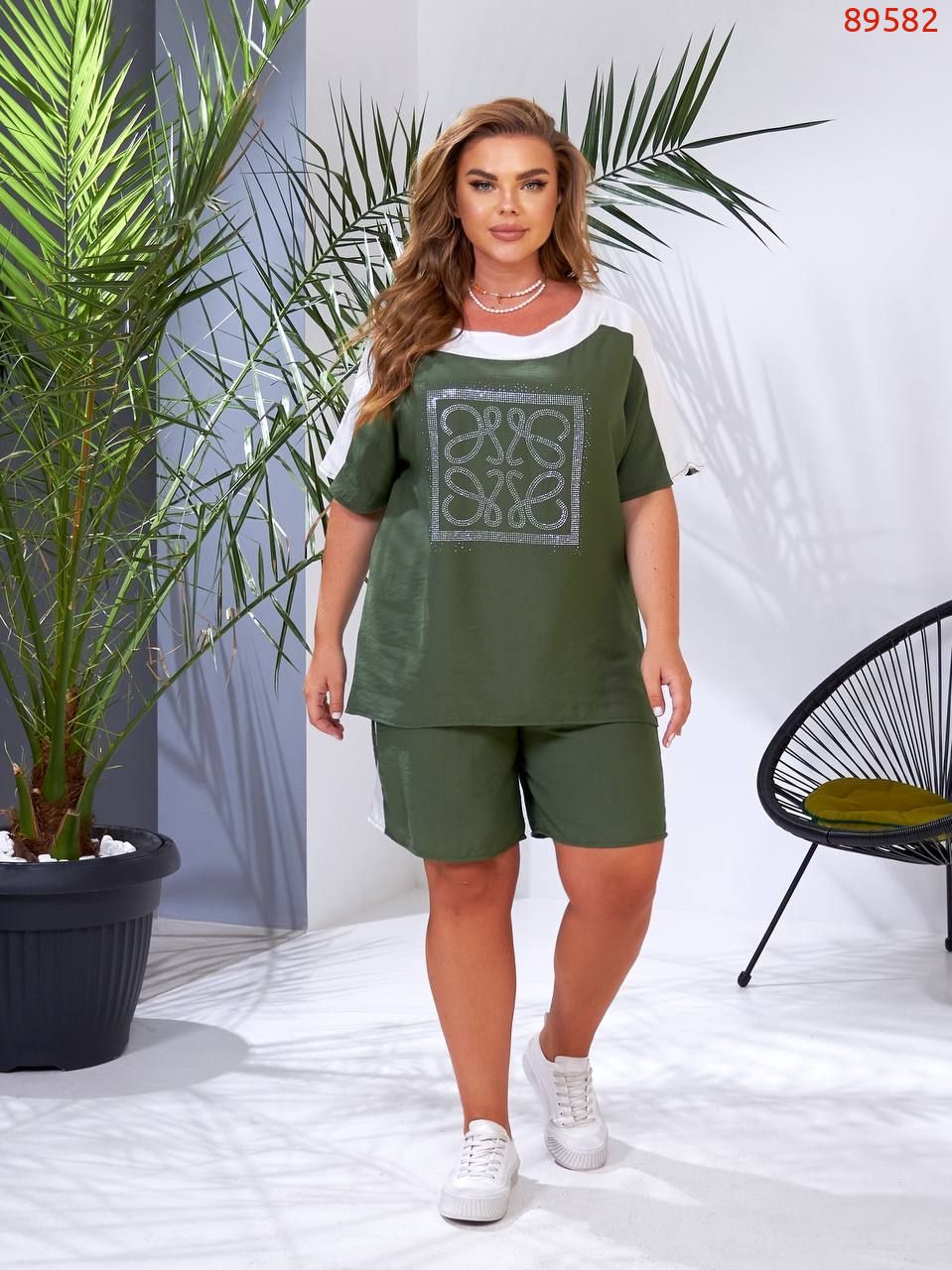 Легкий та яскравий прогулянковий костюм із шортами. Футболка вільного крою, декорована камінням. Шорти вільного крою з високою посадкою, кишені.