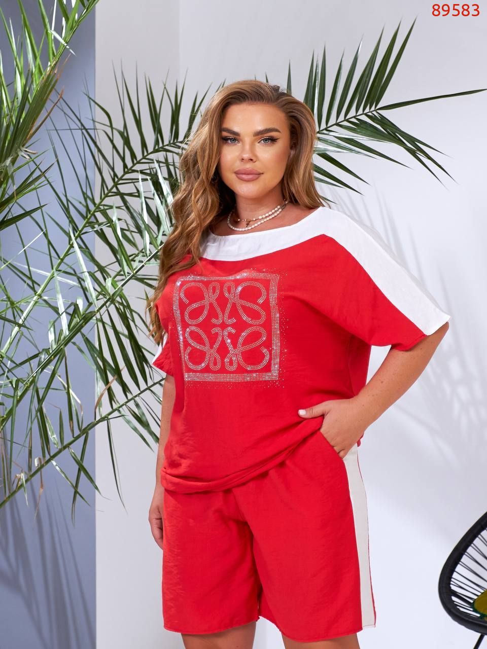 Легкий та яскравий прогулянковий костюм із шортами. Футболка вільного крою, декорована камінням. Шорти вільного крою з високою посадкою, кишені.