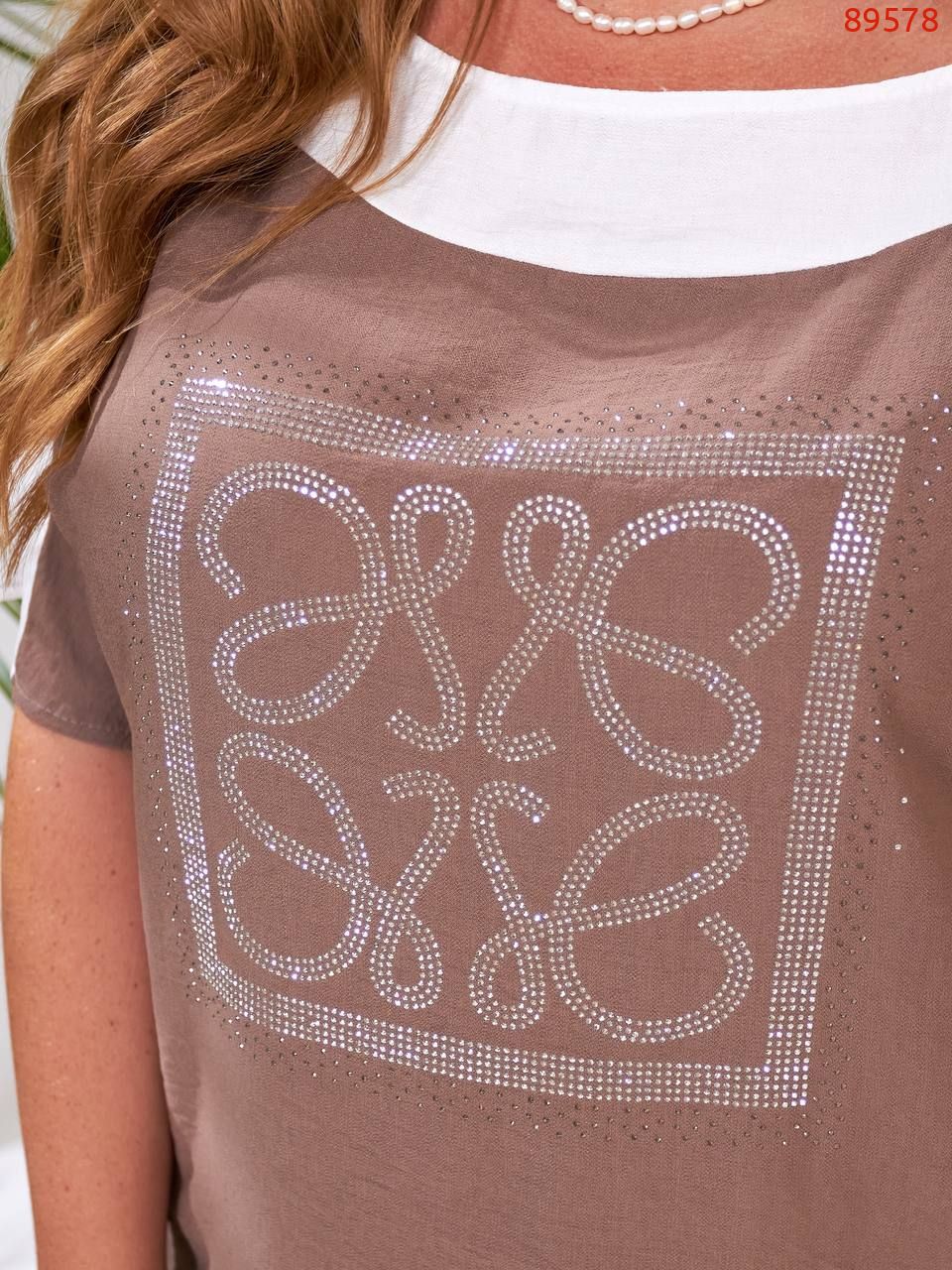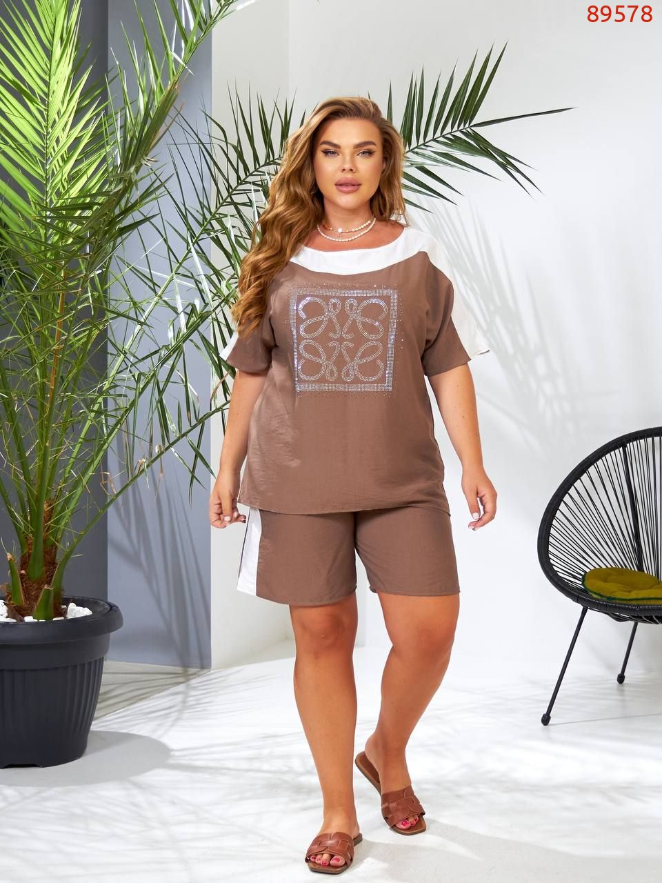 Легкий та яскравий прогулянковий костюм із шортами. Футболка вільного крою, декорована камінням. Шорти вільного крою з високою посадкою, кишені.